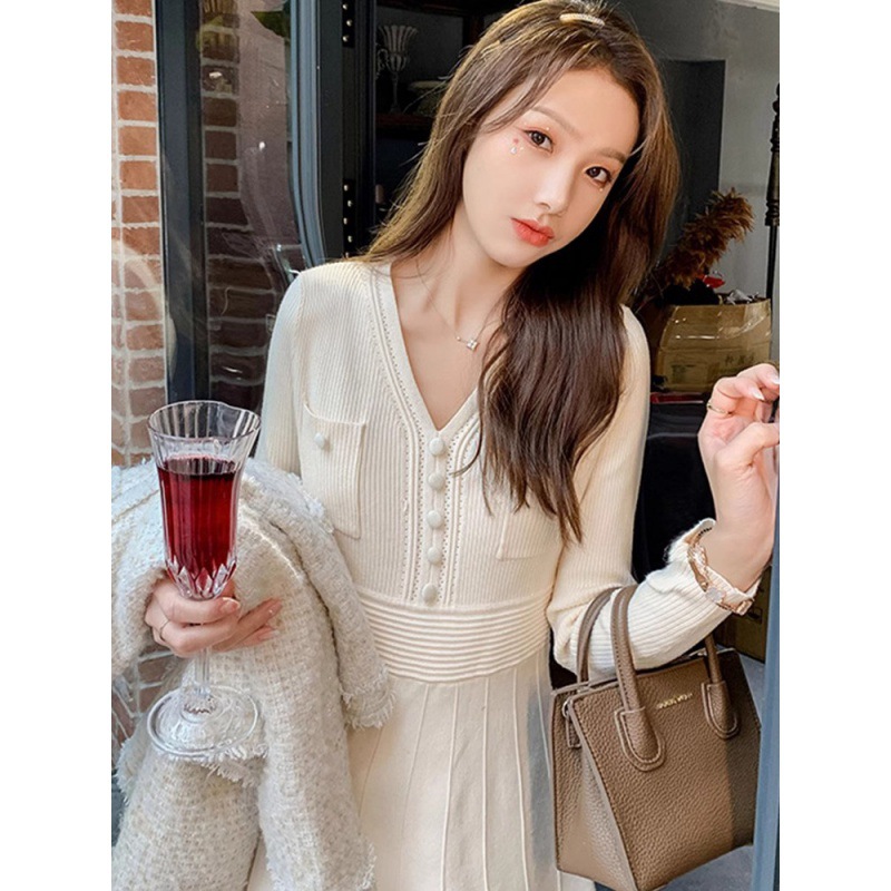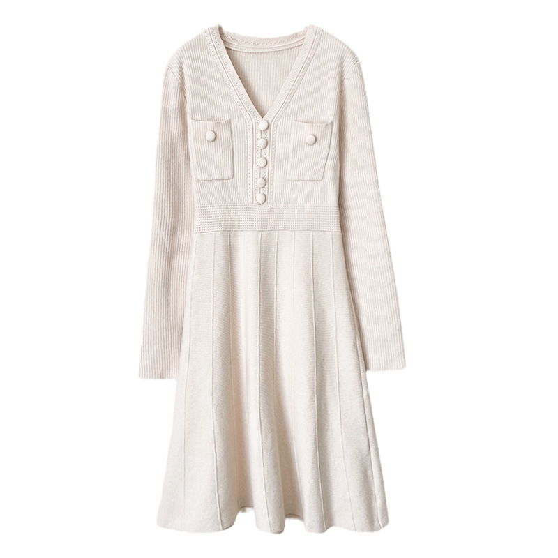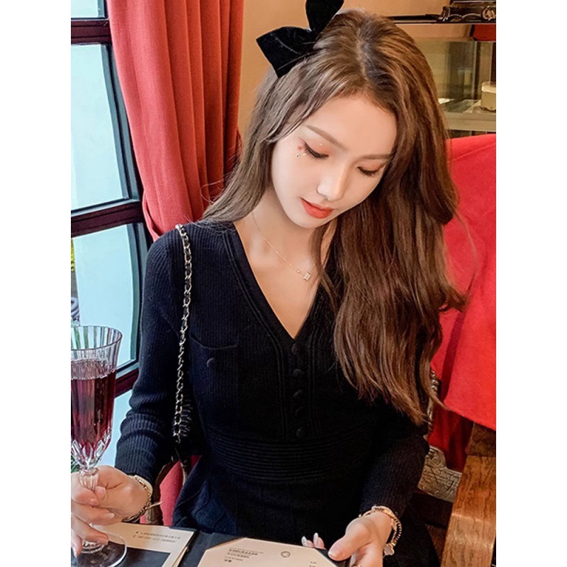 6981大量现货法式气质收腰长袖a字裙法式v领内搭打底针织连衣裙