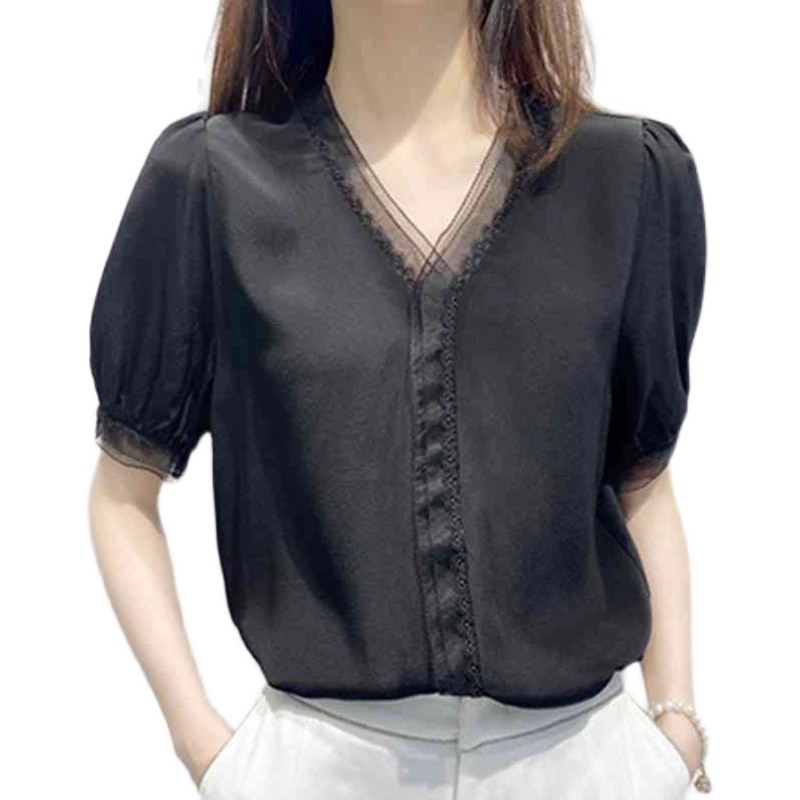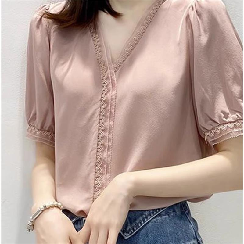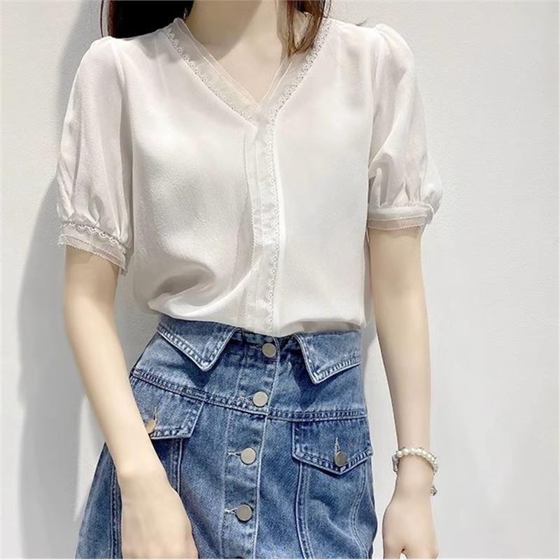 阿玛施女装2024夏季新款V领欧根纱时尚气质纯色雪纺短袖衣女衬衫