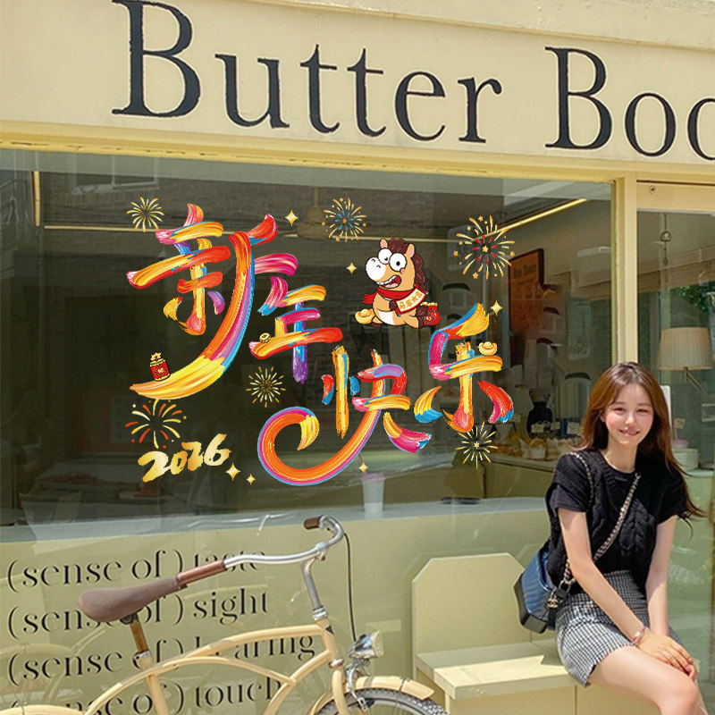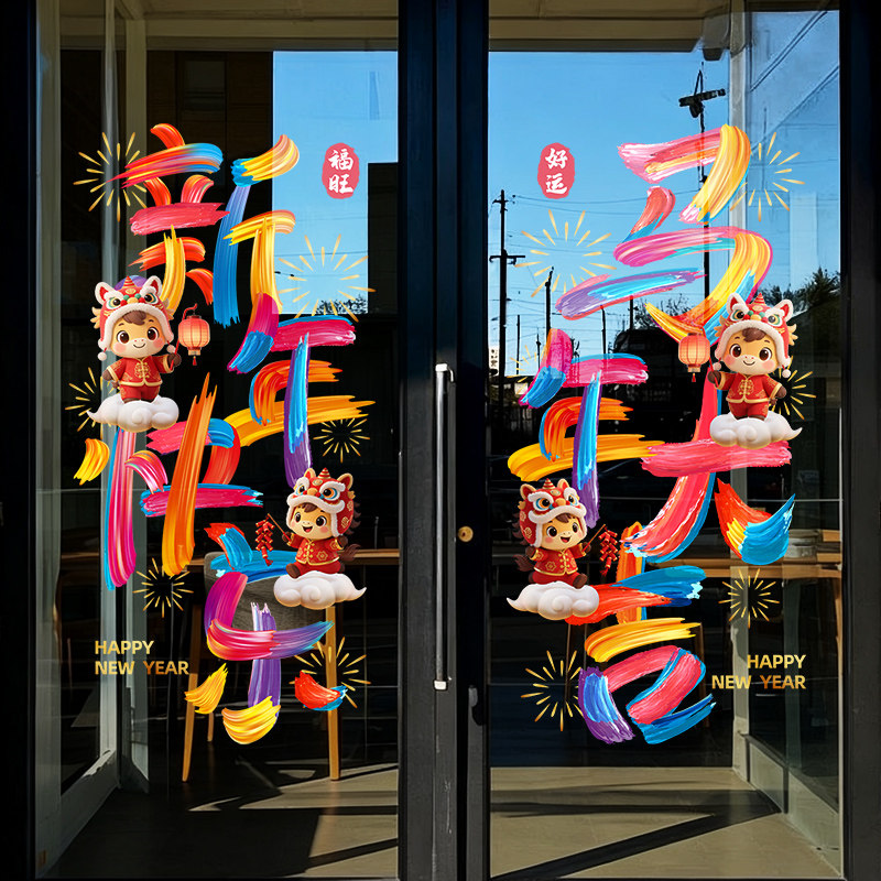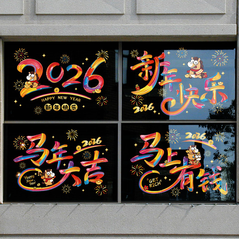 新年快乐节日布置商店橱窗玻璃静电窗花贴纸装饰马年大吉彩字贴画
