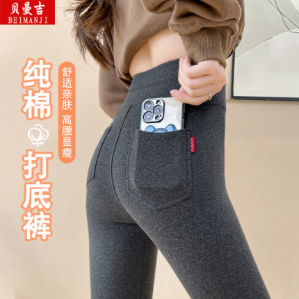 带口袋打底裤女新款外穿春秋大码纯棉高腰显瘦秋裤弹力紧身长裤子