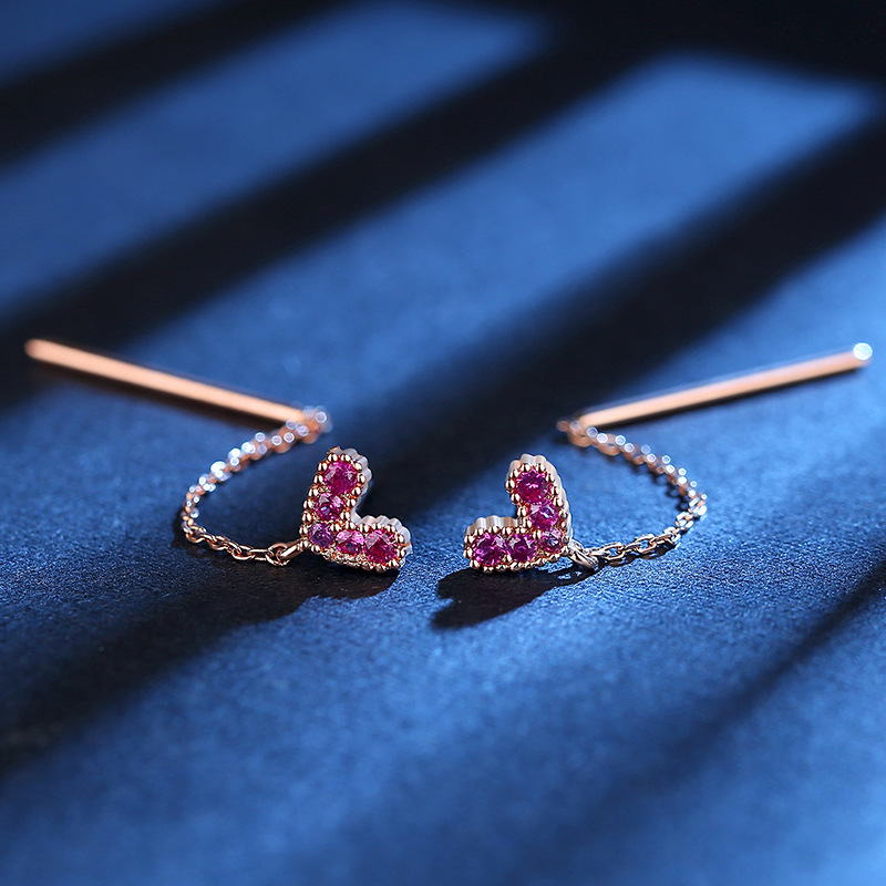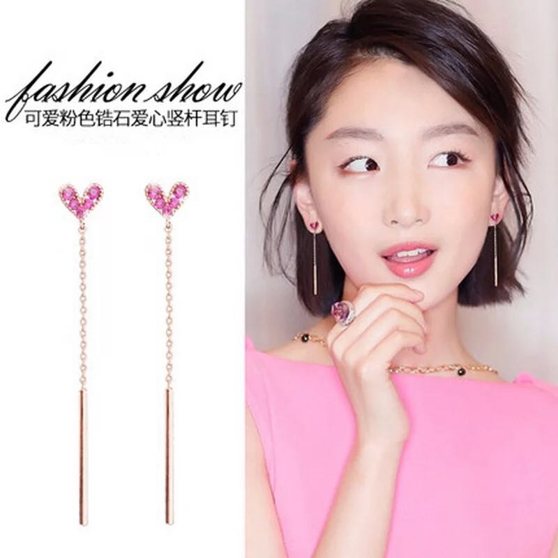 925纯银针爱心耳钉耳线 粉色少女心形长款气质耳坠个性耳环配饰品
