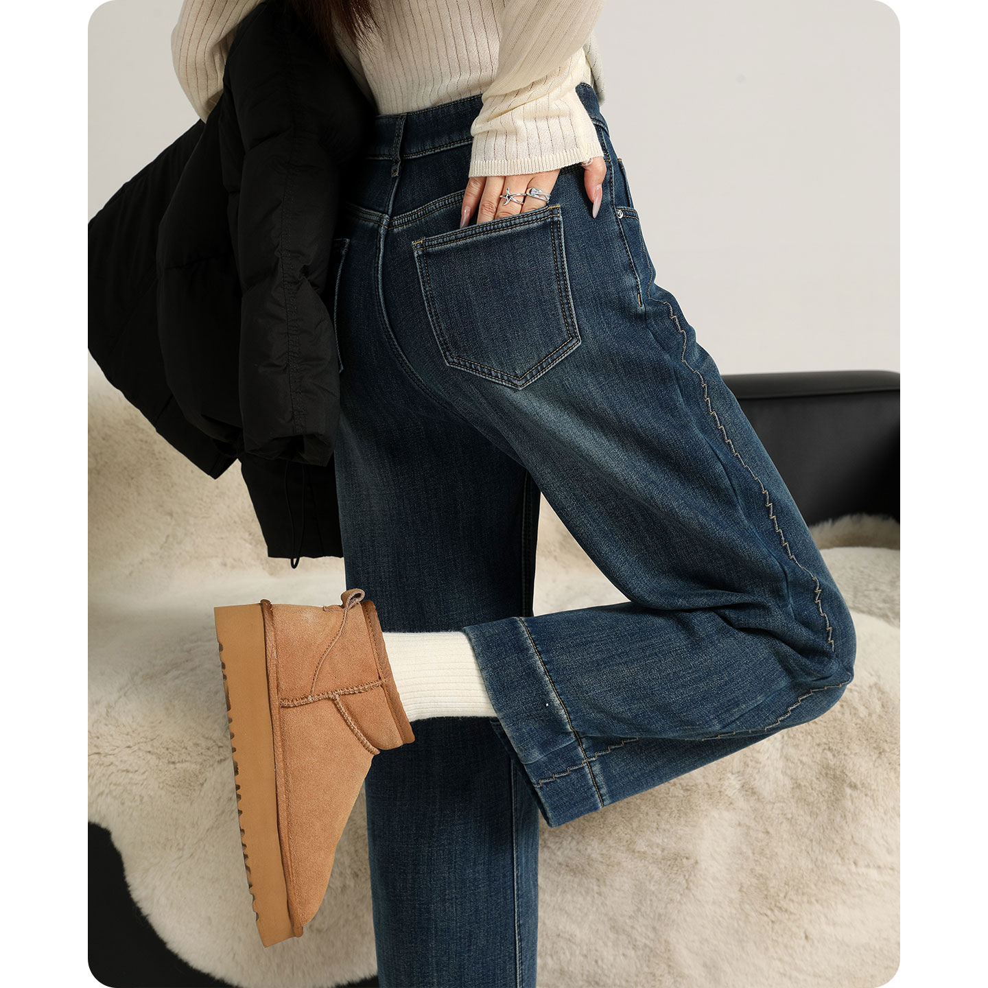 拉夏贝尔复古阔腿牛仔裤女秋冬2025年新款加绒小个子九分直筒裤子
