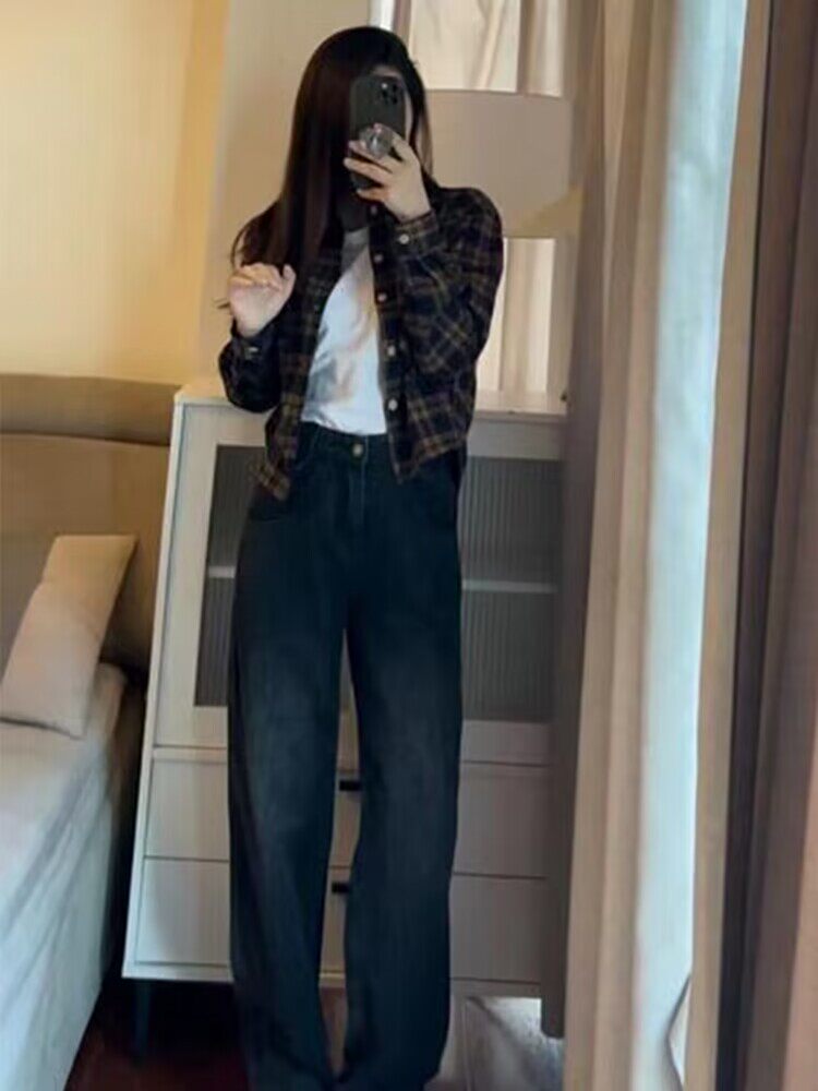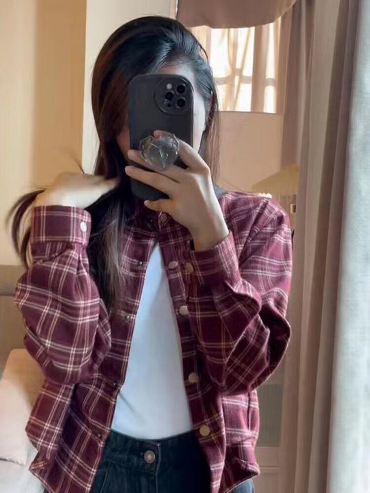 磨毛复古格子衬衫女短款外套春秋2023新款爆款长袖上衣高级感衬衣
