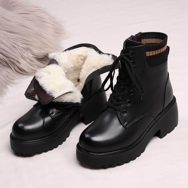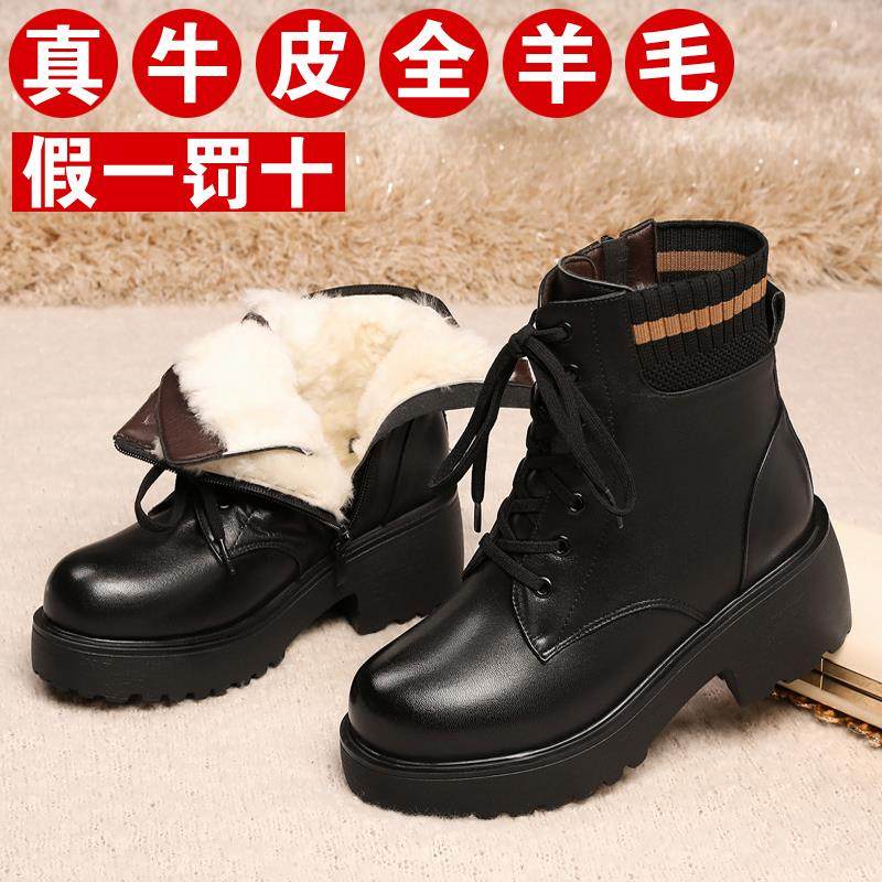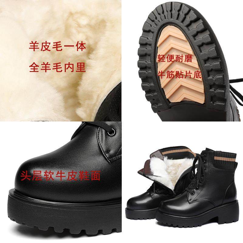 高档冬女季粗跟低中跟厚底丁靴女毛短靴士真皮羊妈妈棉鞋女式棉皮
