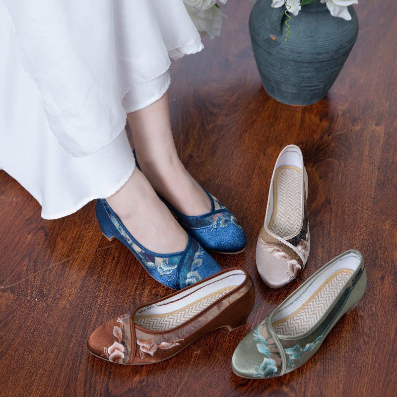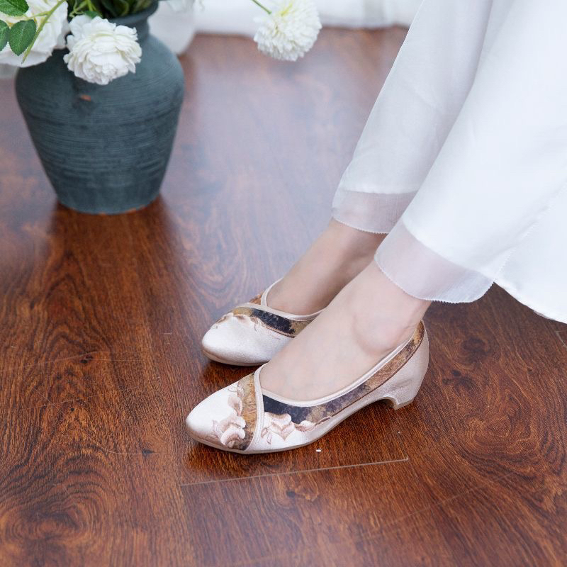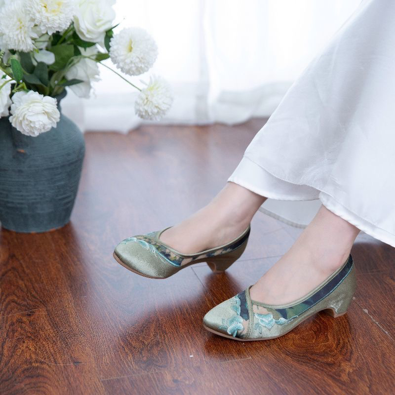新中式鞋子春夏女鞋配马面裙子尖头粗跟绣花缎面旗袍鞋老北京布鞋