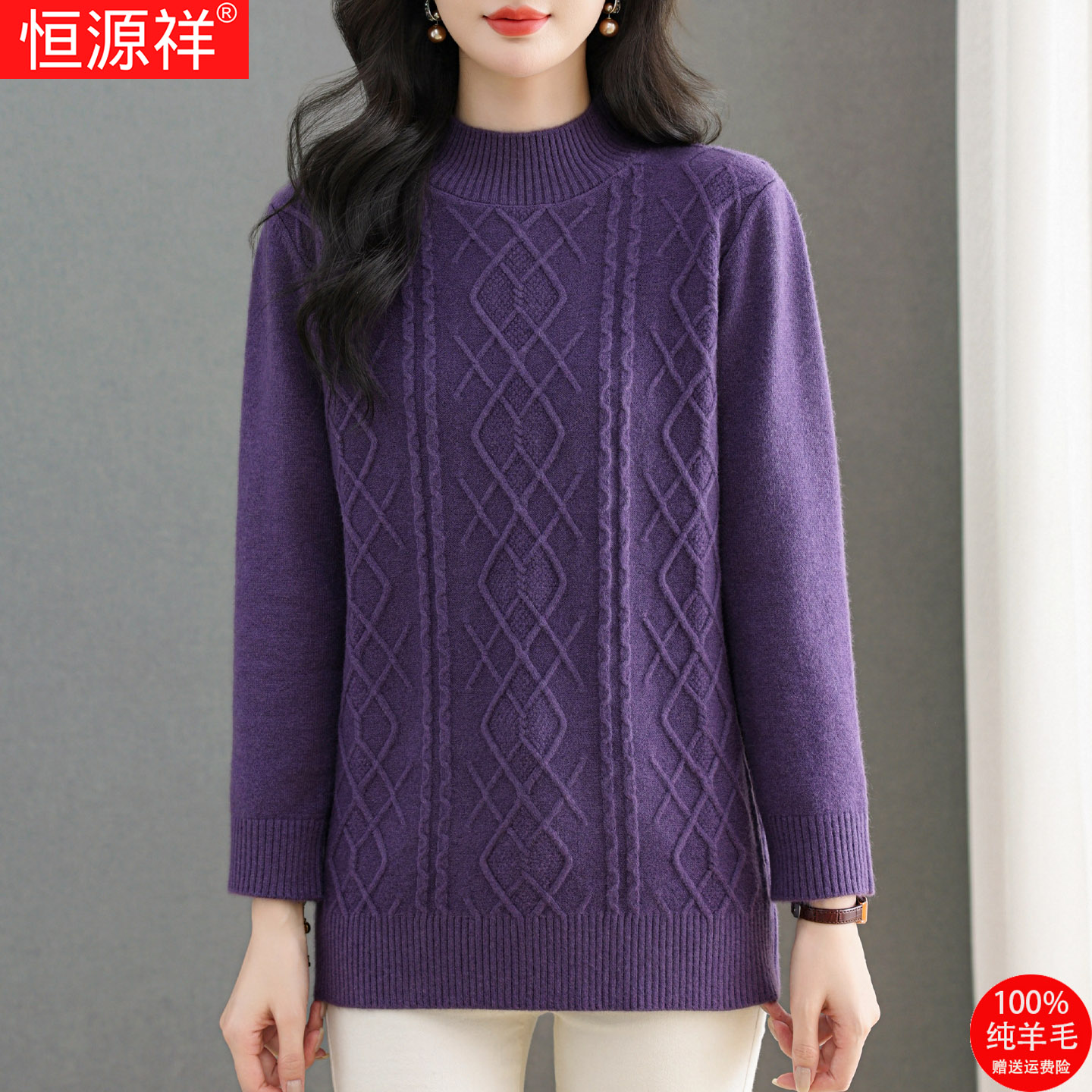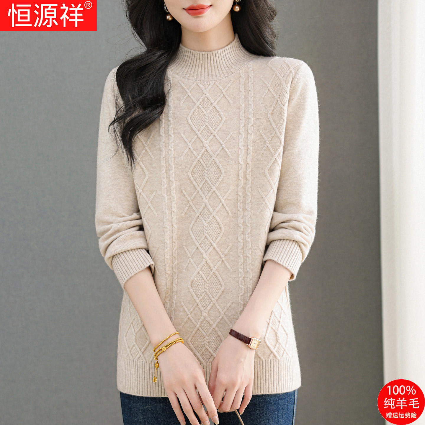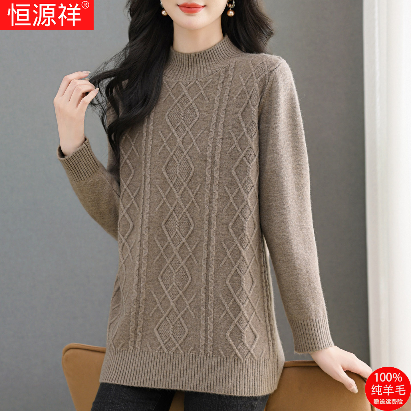 恒源祥新款百搭羊毛衫女冬季中长款半高领毛衣妈妈针织显瘦打底衫