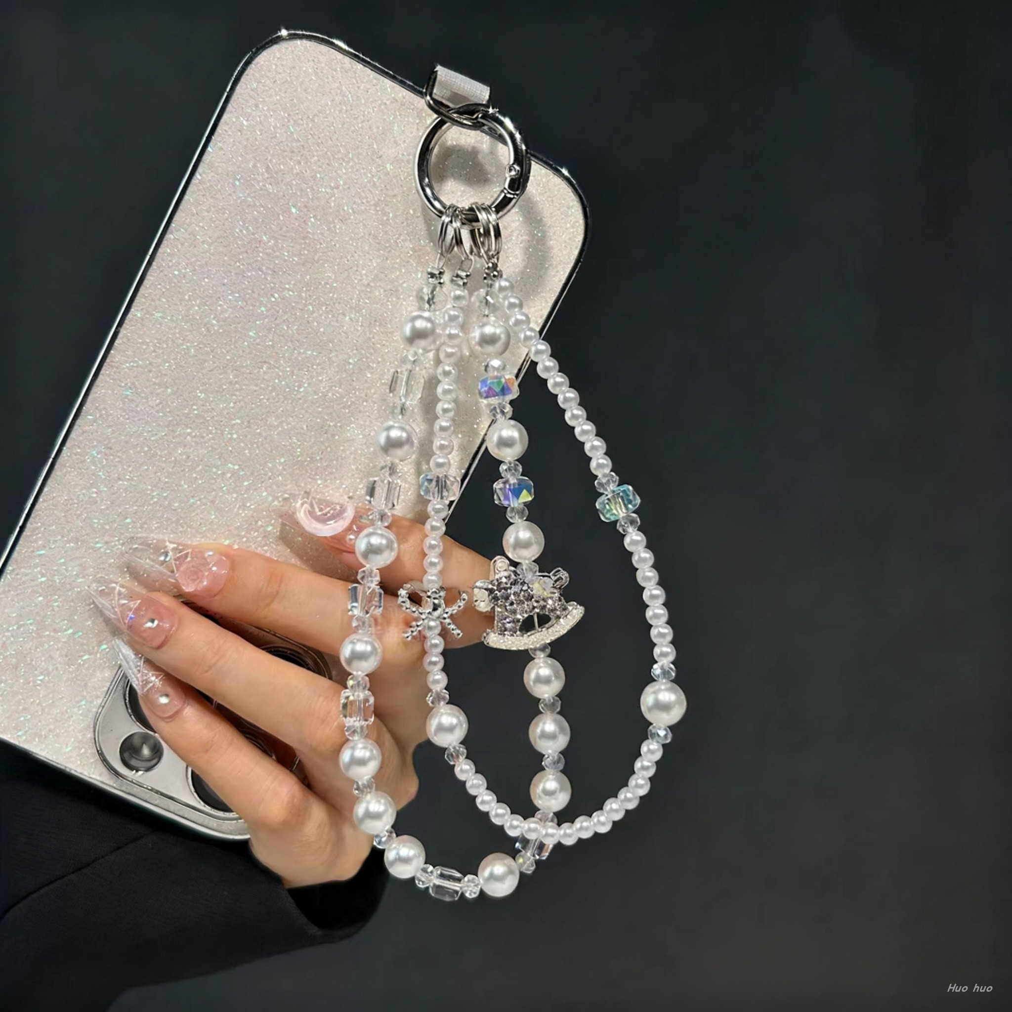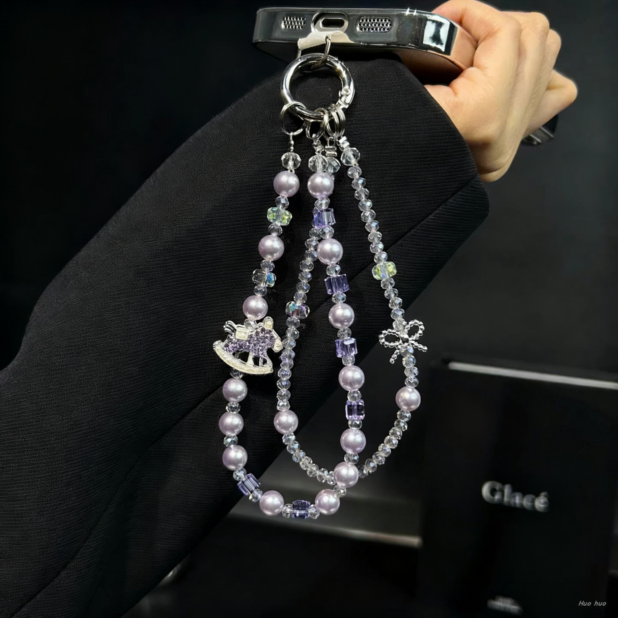 满钻木马手机链双层珍珠手腕挂链水晶手提链条轻奢串珠防丢绳挂饰