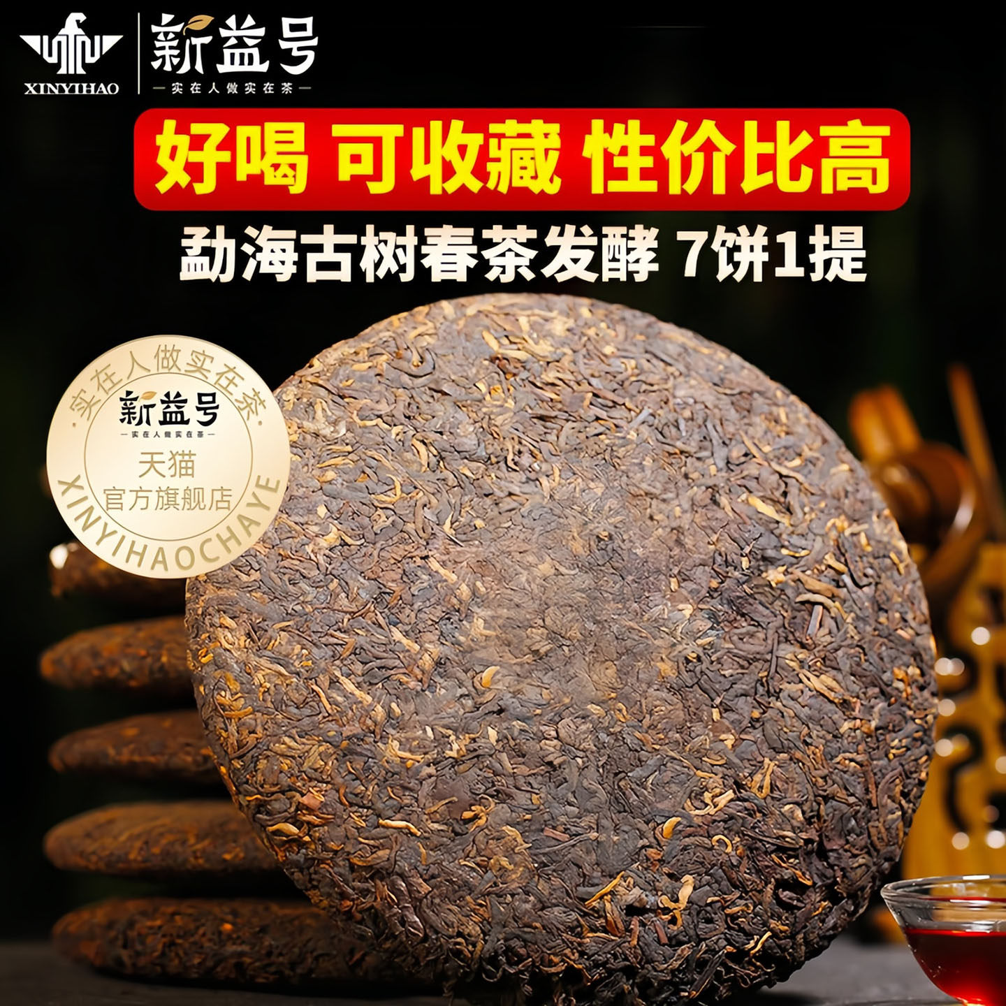 普洱茶熟茶饼新益号陈年云南七子饼茶包勐海茶叶黑茶潽洱荼熟普洱