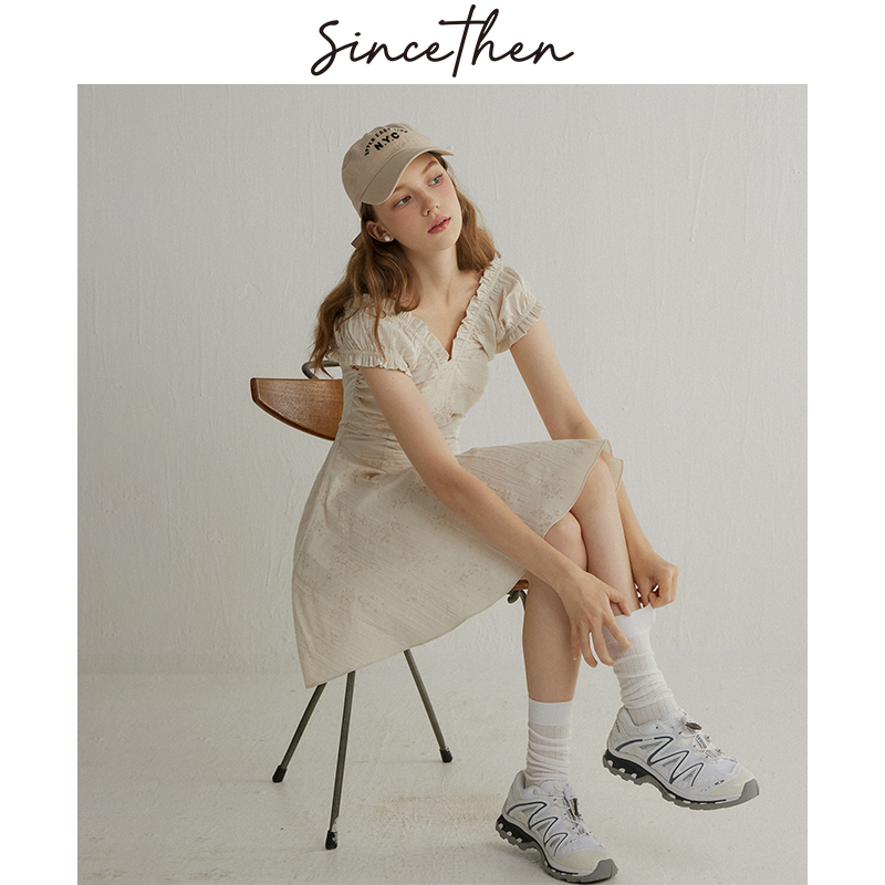 sincethen美式女友法式碎花裙子v领短裙褶甜美皱连衣裙女夏季新款