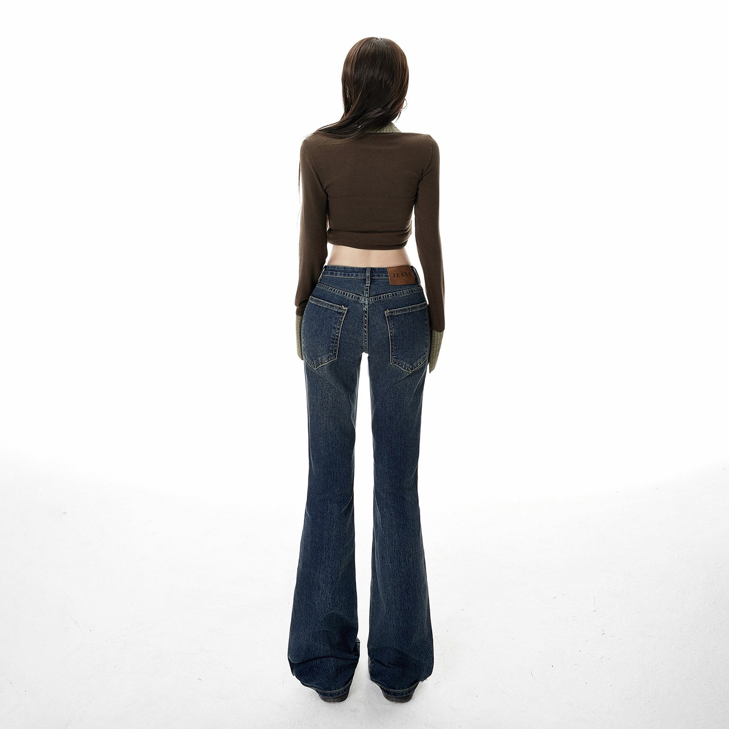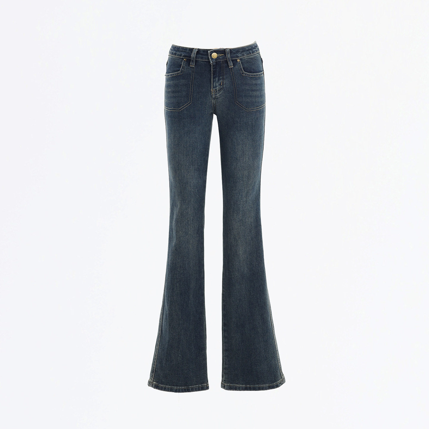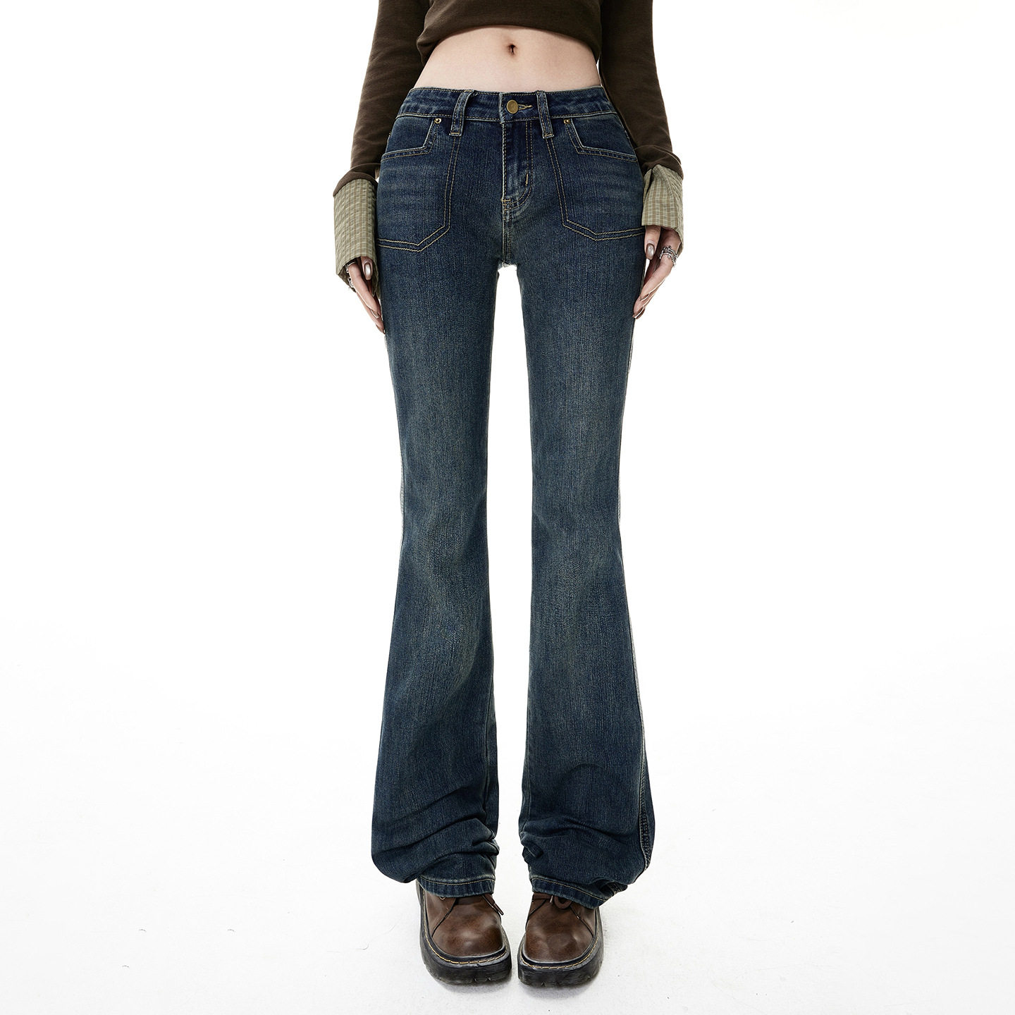深蓝色美式复古低腰修身喇叭牛仔裤女秋冬百搭显瘦弹力
