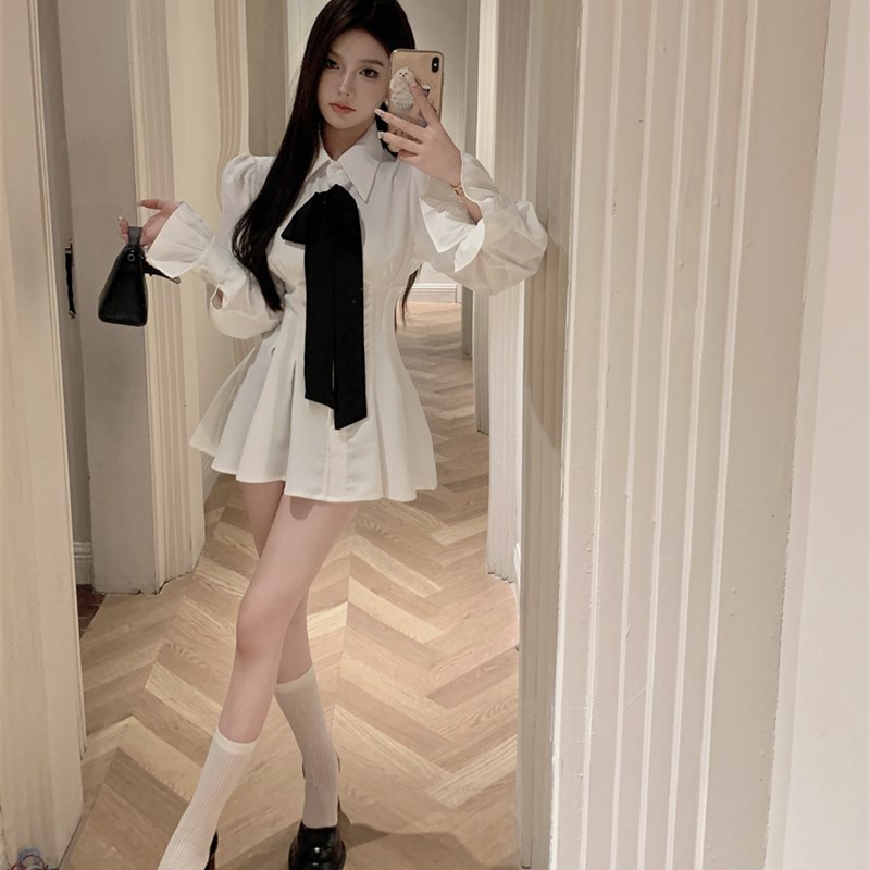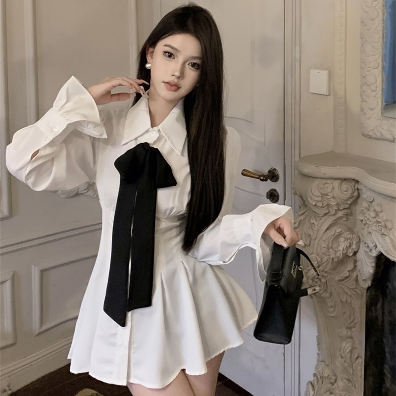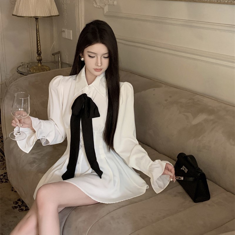 法式温柔长袖衬衫连衣裙女秋季白色缎面裙子收腰修身气质a字短裙