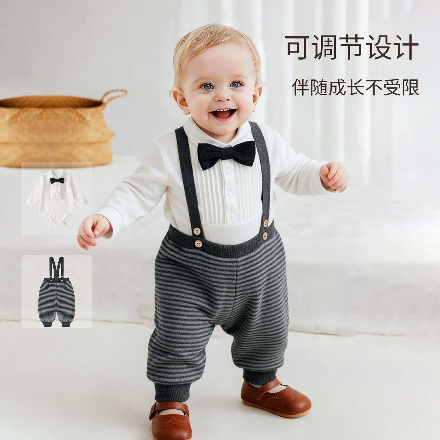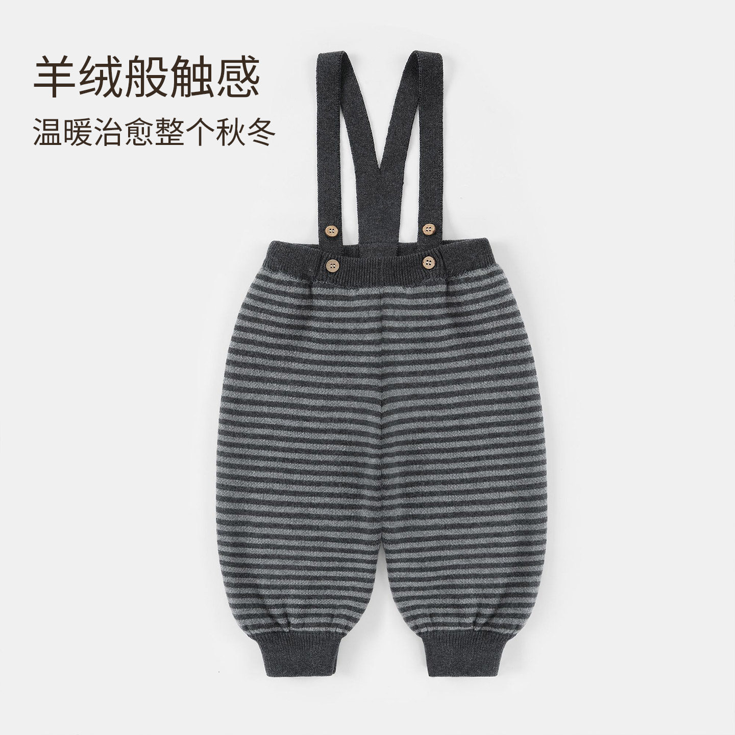 Oak mont男童条纹裤子秋冬宝宝一体绒背带裤儿童保暖加绒针织长裤