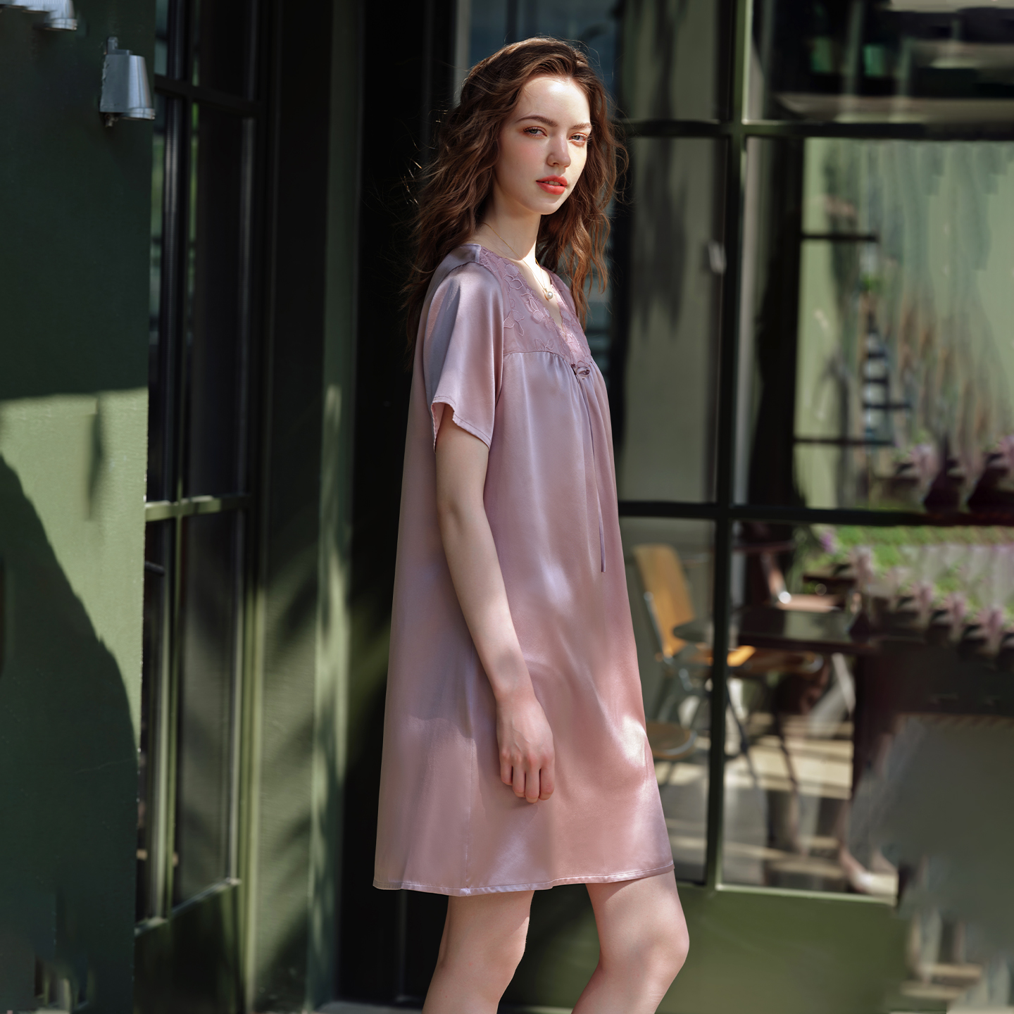 美标19姆米重磅短袖真丝睡裙女夏6A级100%桑蚕丝绸睡衣高档家居服