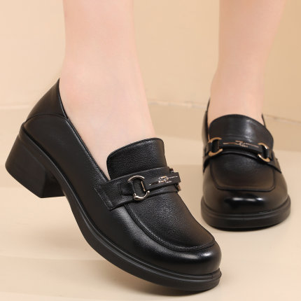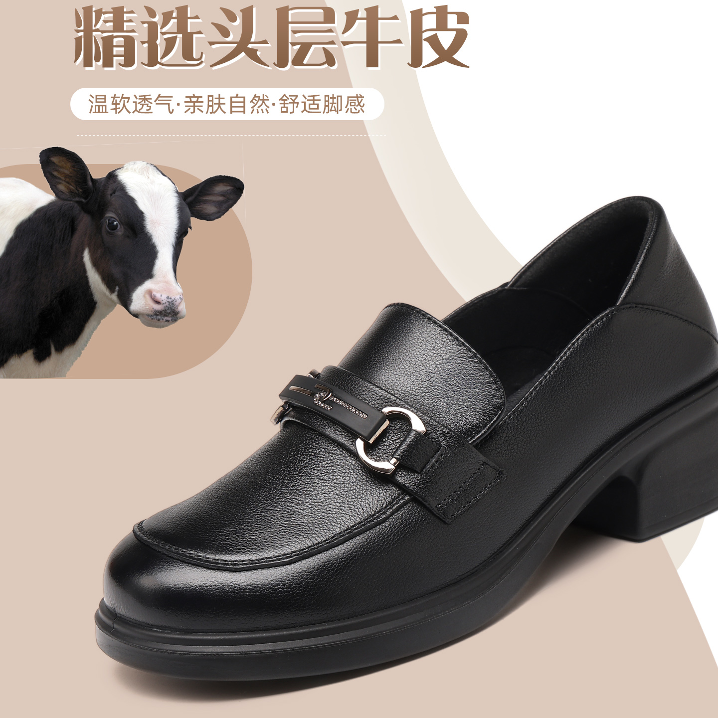 中年妈妈工作鞋半高跟女土一脚蹬牛皮粗跟皮鞋真皮软不累脚配裙子