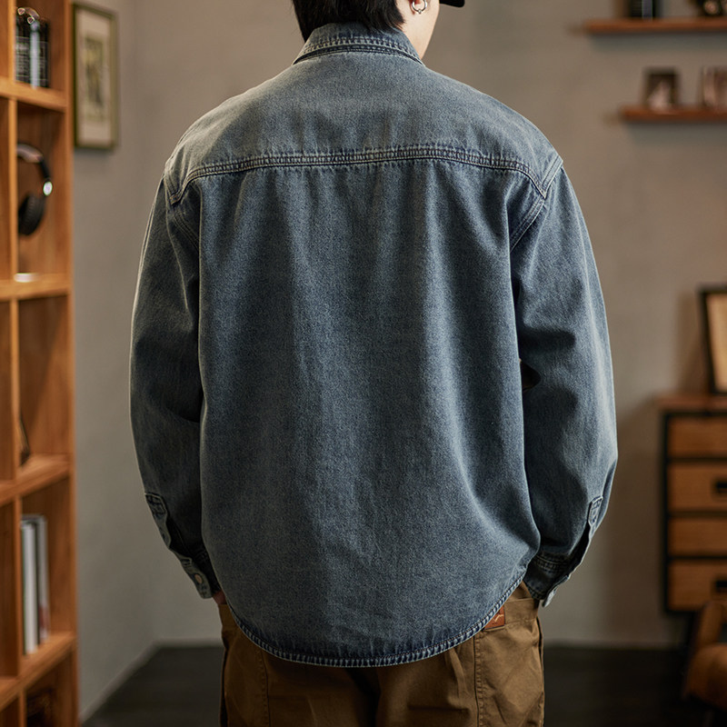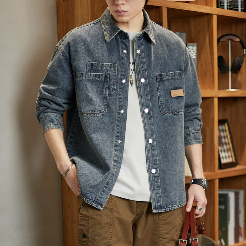 美式复古水洗牛仔衬衫男士春季新款潮牌拼接宽松痞帅工装衬衣外套