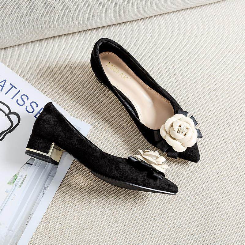 2023春秋尖头茶花单鞋中跟粗跟女鞋大码鞋浅口女时尚瓢鞋粗跟单鞋