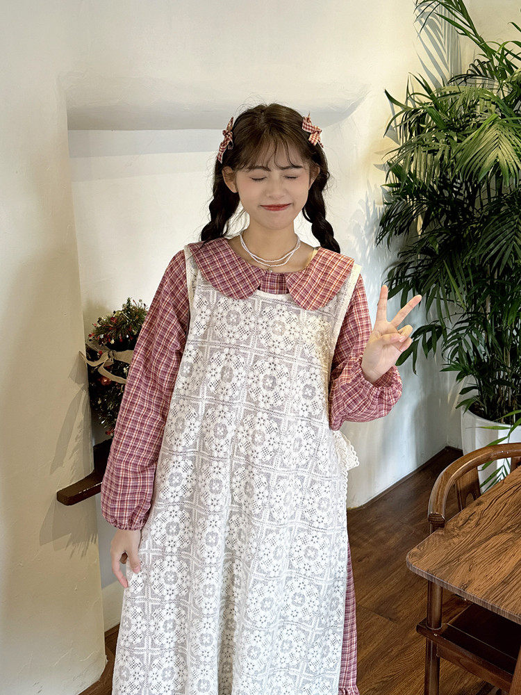 日系少女红色格子棉麻连衣裙复古镂空蕾丝绑带叠穿背心罩衫裙长裙