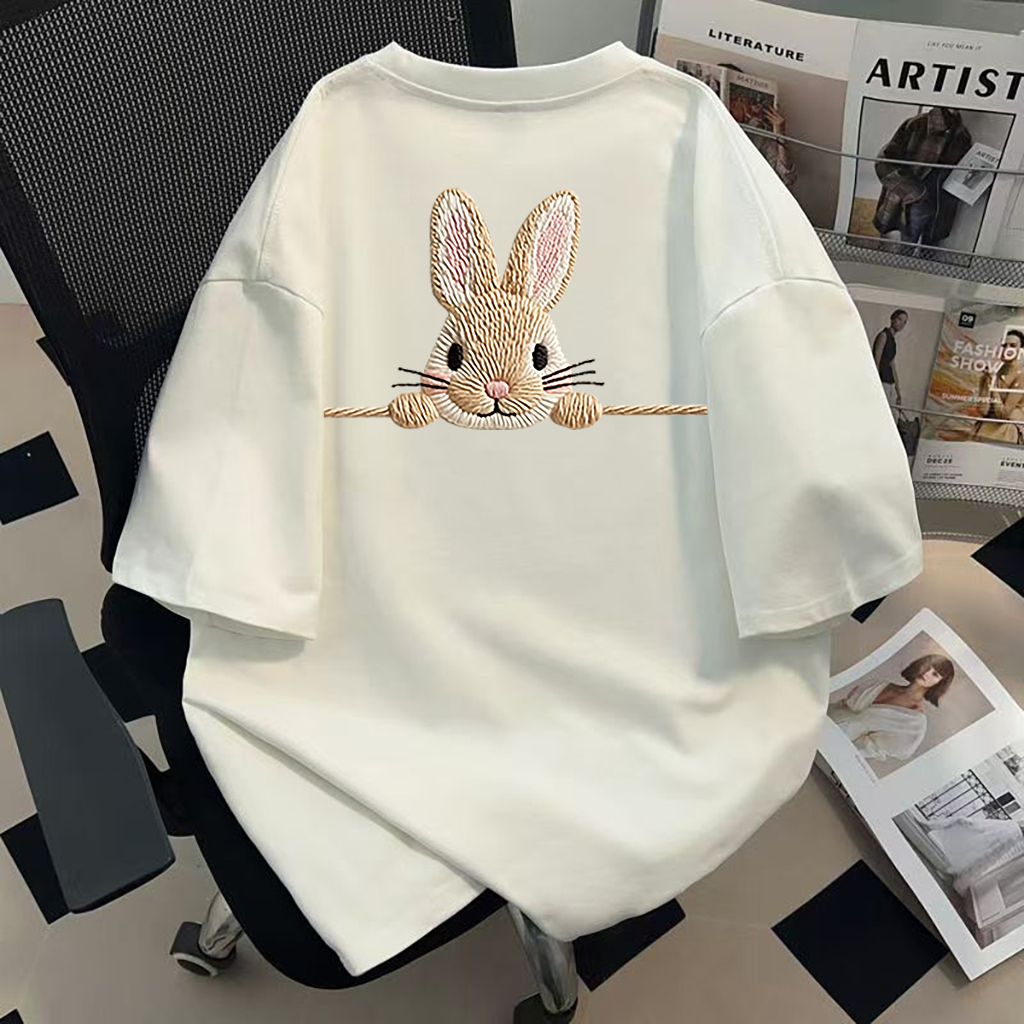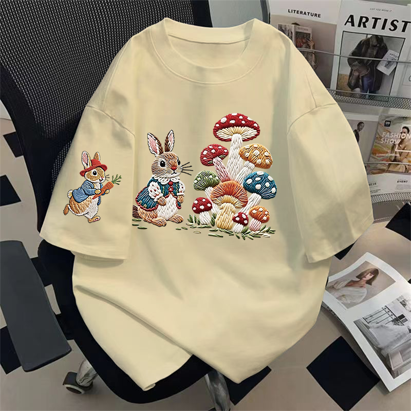 纯棉蘑菇兔子短袖t恤女夏2025新款仿刺绣白色时尚减龄圆领上衣潮
