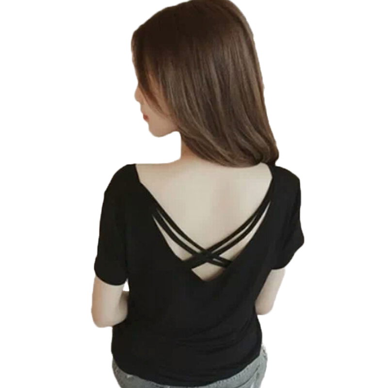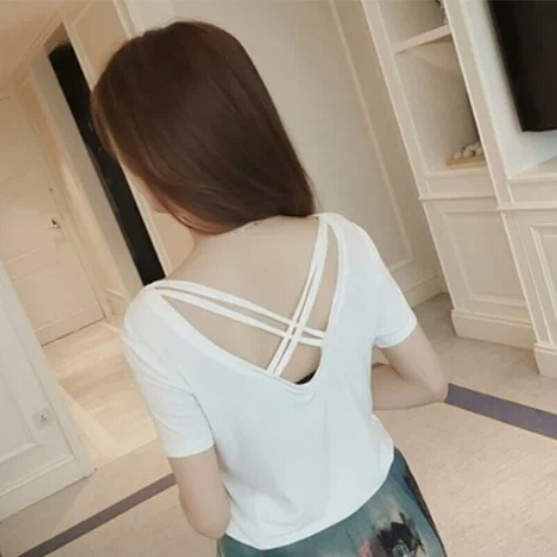 T恤女短袖夏宽松百搭打底衫露背交叉正肩舒适弹力大码设计感上衣