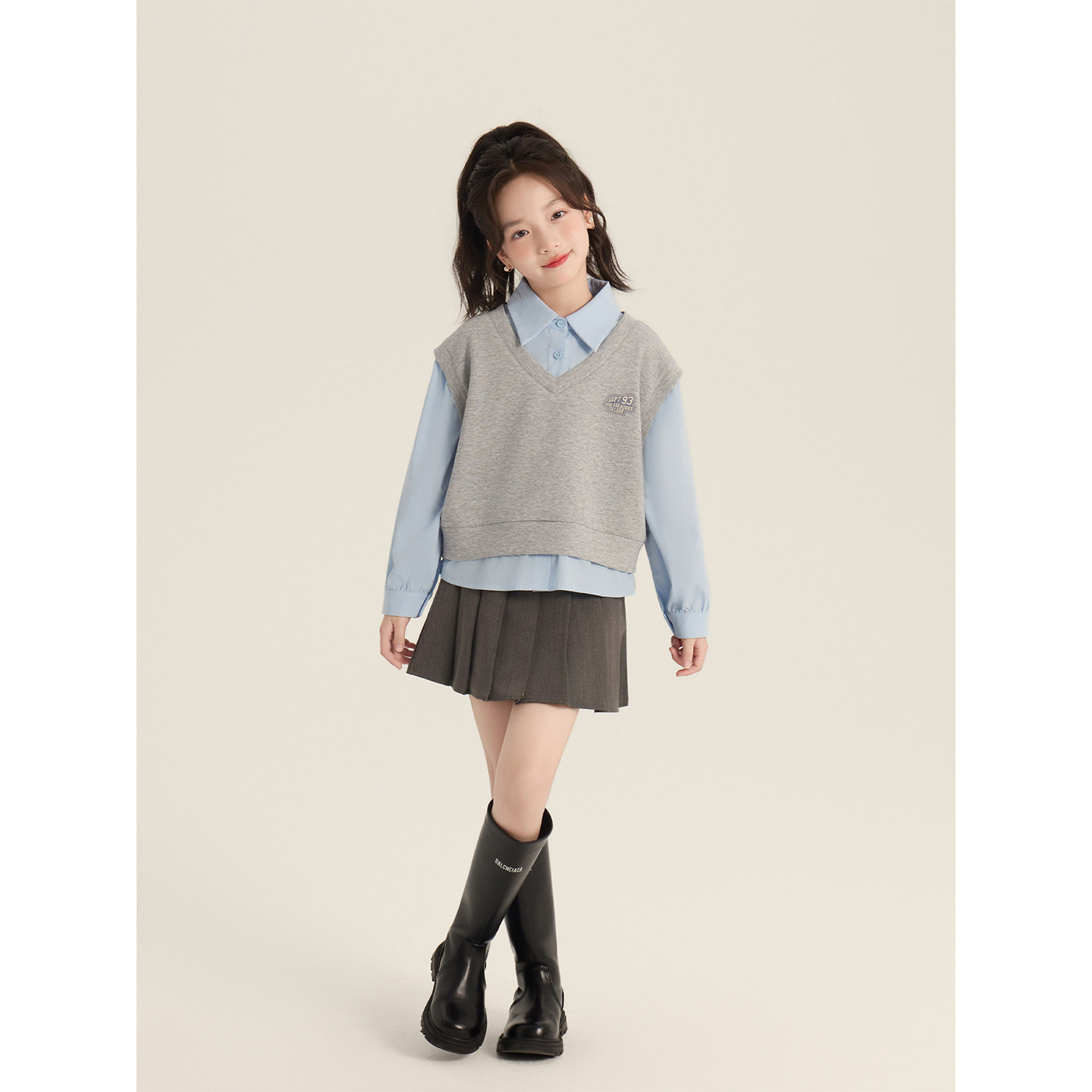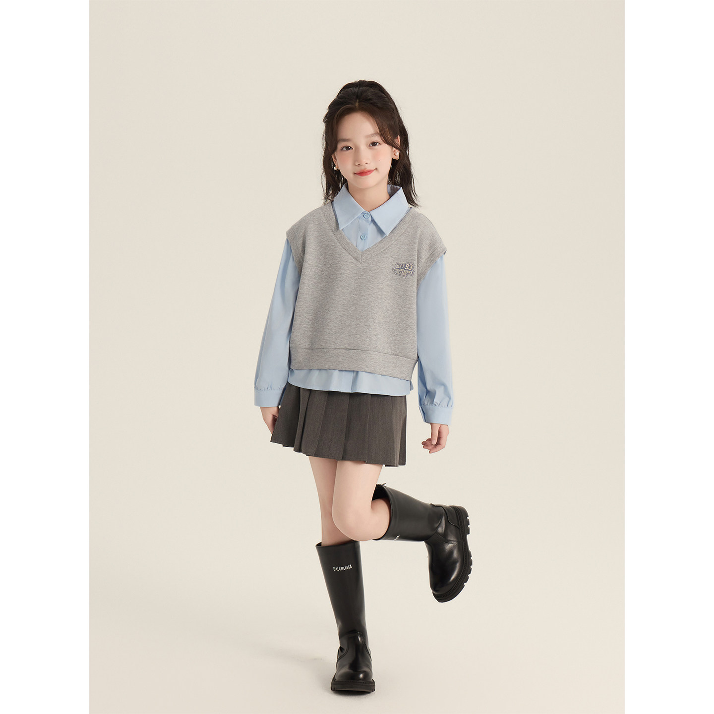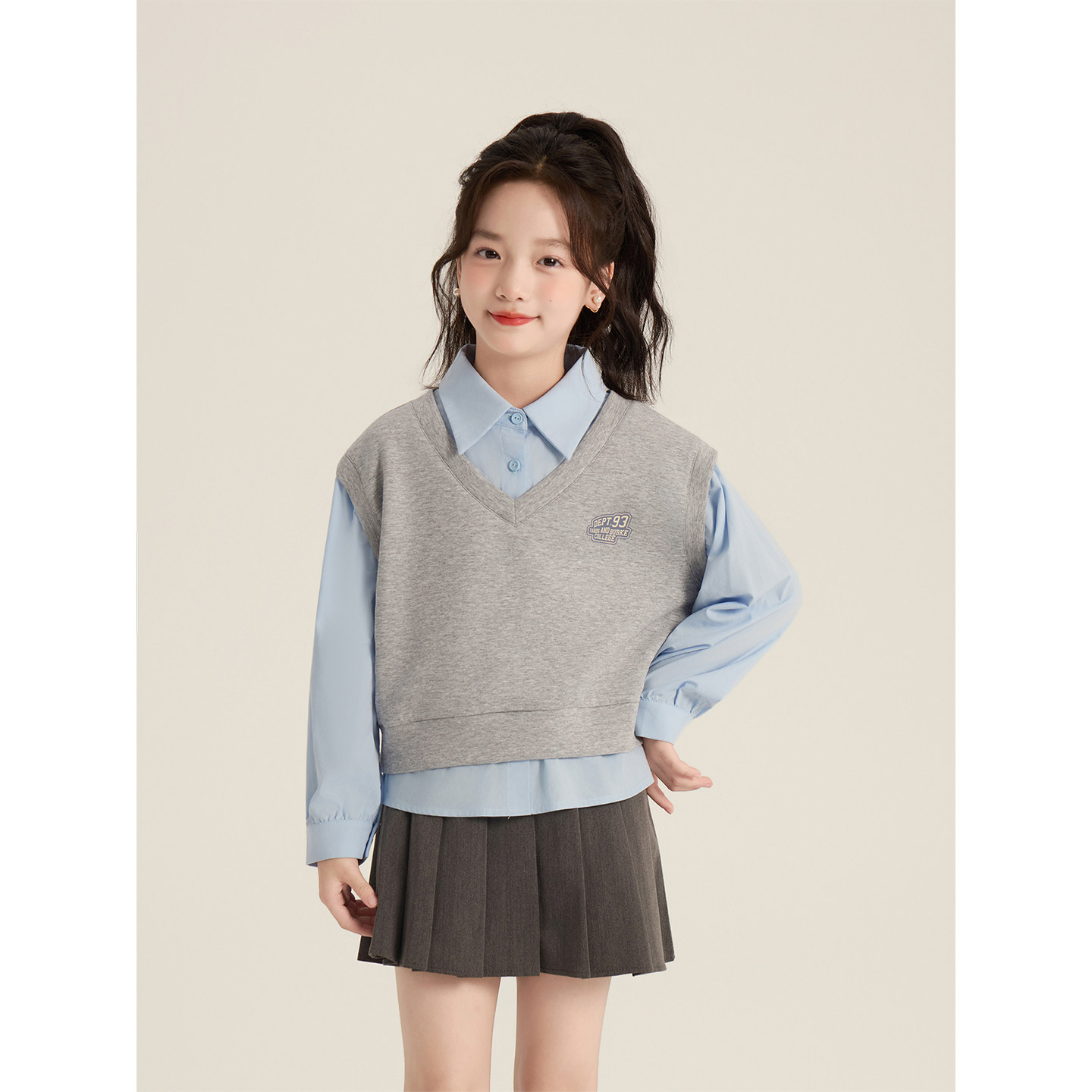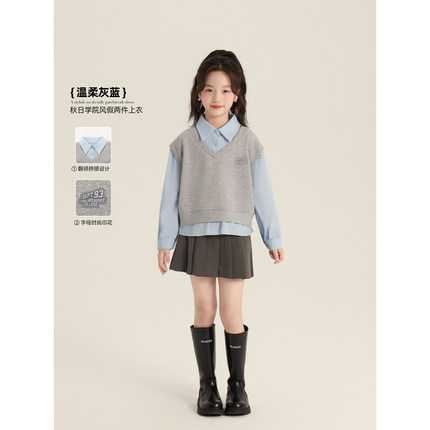 Amybaby女童上装秋季2025新款韩版秋日学院风假两件拼接衬衫上衣