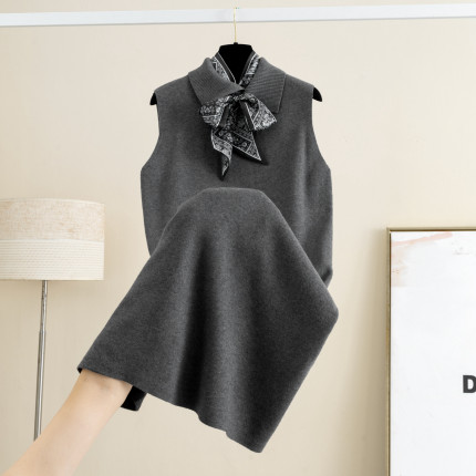 羊毛翻领配丝巾针织背心连衣裙女秋冬新款无袖宽松内搭长裙马夹裙