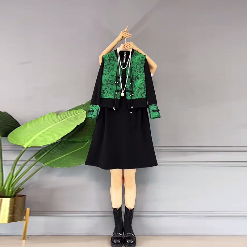 大码女装流苏盘扣国风马甲拼色袖口圆领连衣裙胖MM气质显瘦两件套