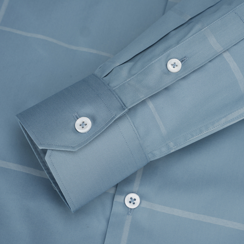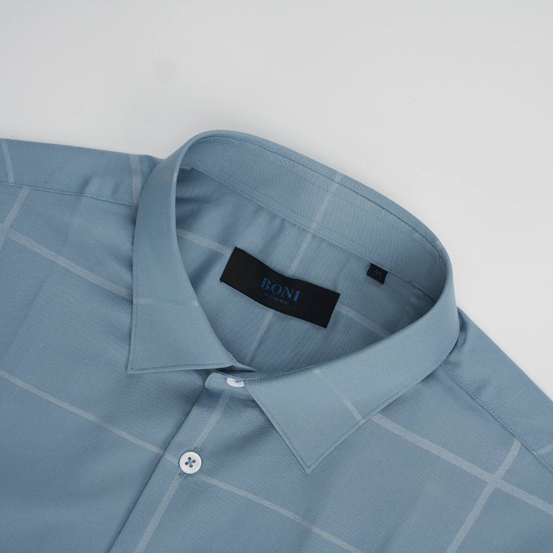 BONI/堡尼春夏新品蓝色格纹化纤长袖衬衫商务混纺衬衣男GL287041A