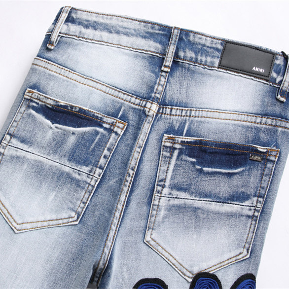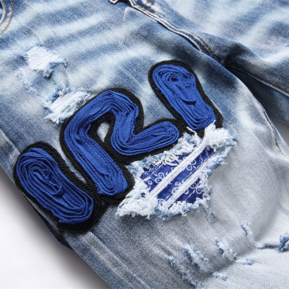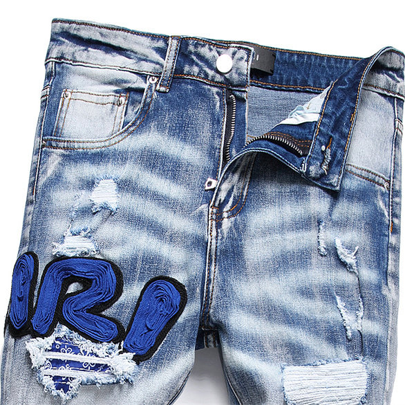 广州高版本AM蓝色织带牛仔裤破洞潮流弹力修身小脚时尚裤百搭男裤