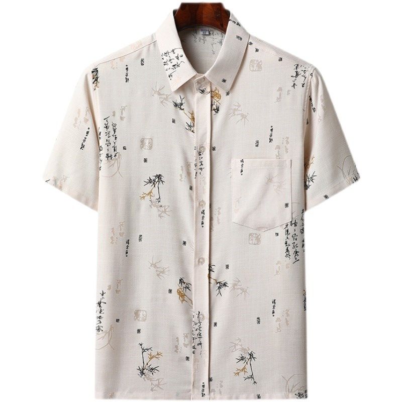 中老年人男士棉麻大码短袖翻领衬衫爸爸休闲上衣夏季衬衣爷爷装薄