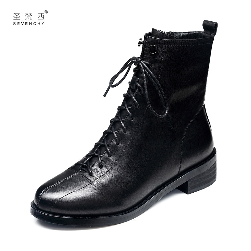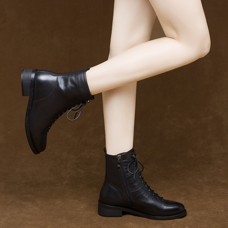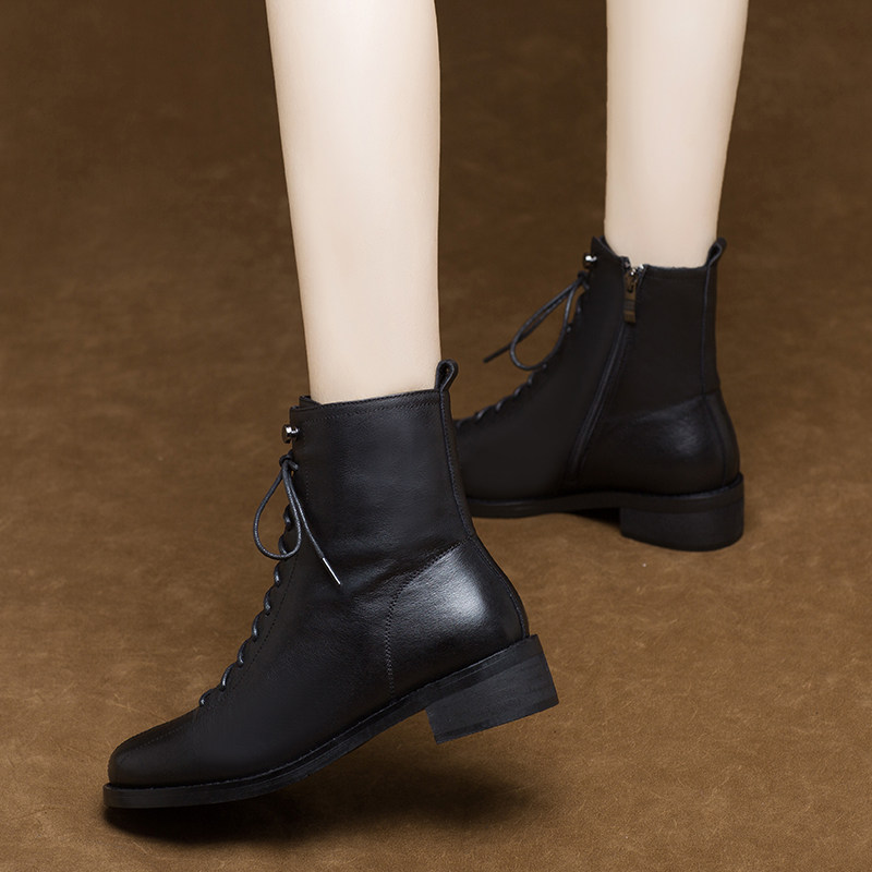 2025新款秋冬季女鞋软皮系带马丁靴英伦风平底短靴加绒女靴真皮鞋