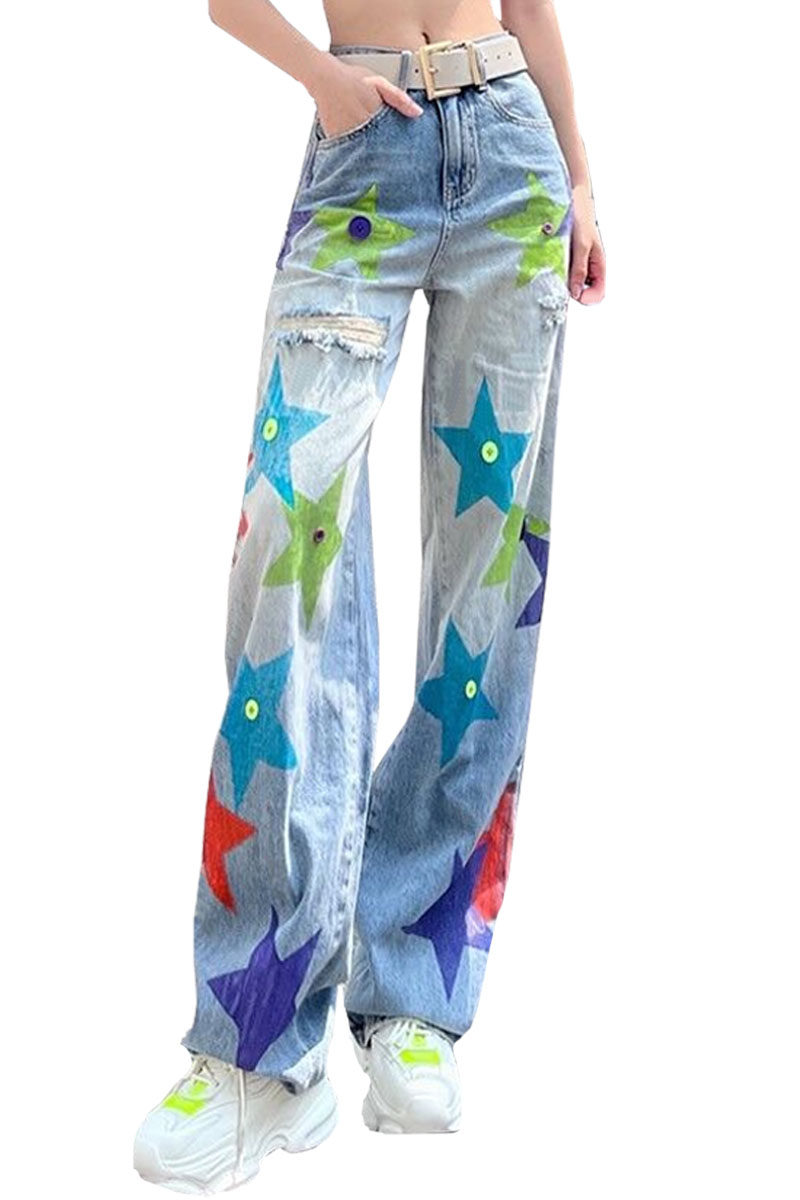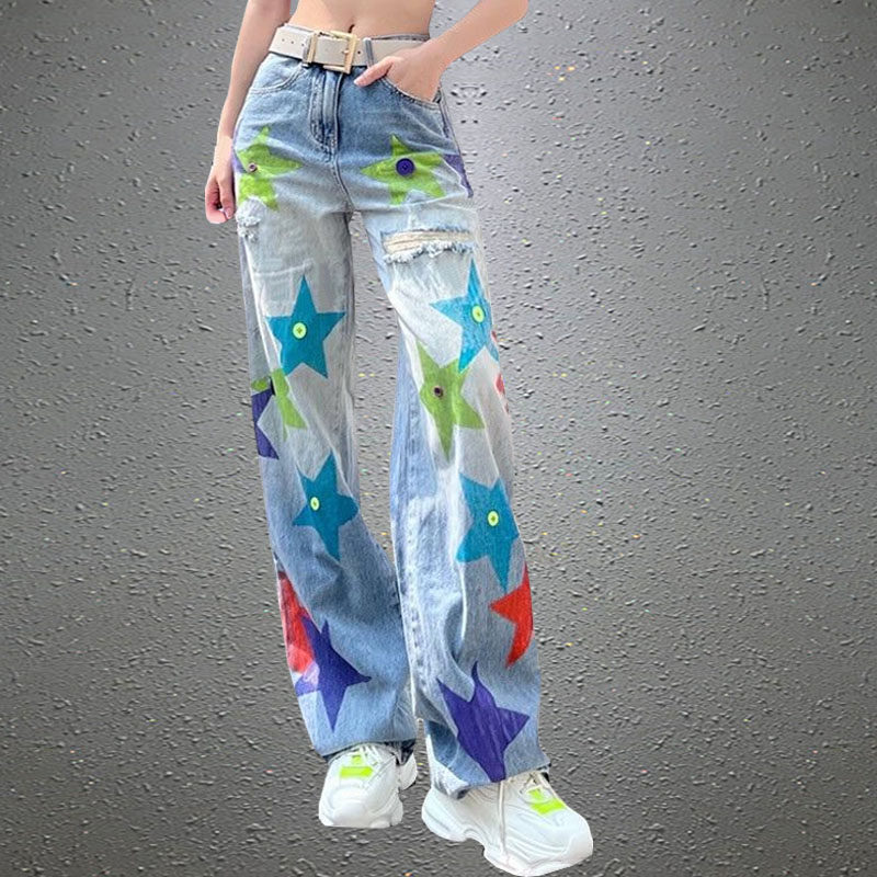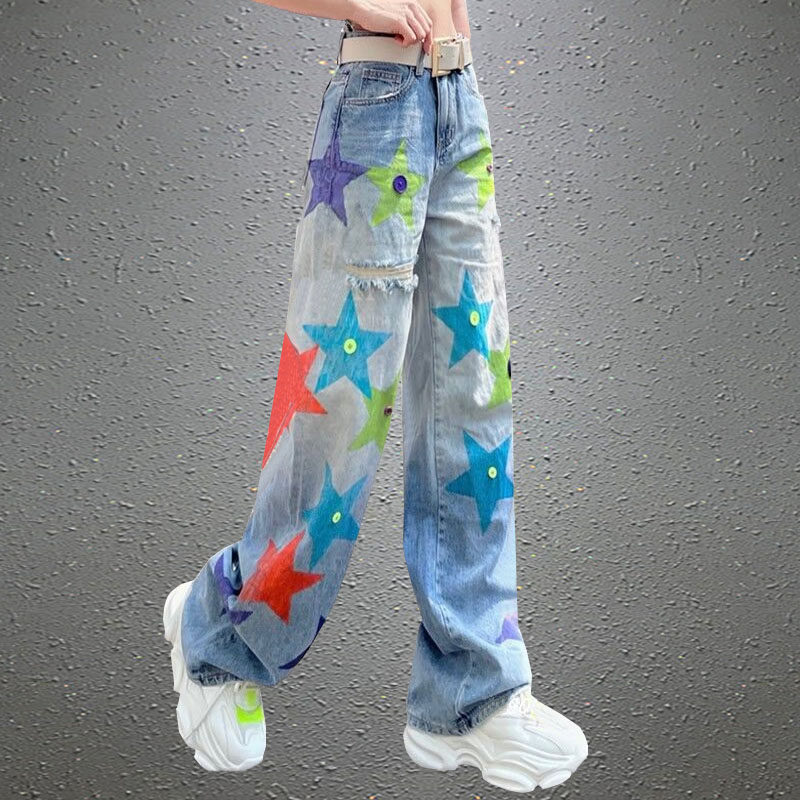 欧洲站破洞牛仔裤女2025秋季新款欧货彩绘高腰宽松直筒拖地裤长裤