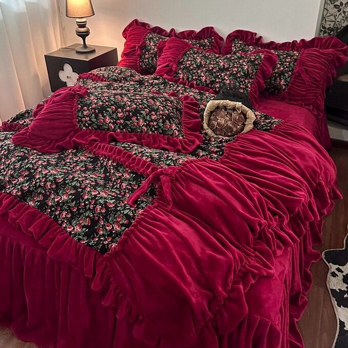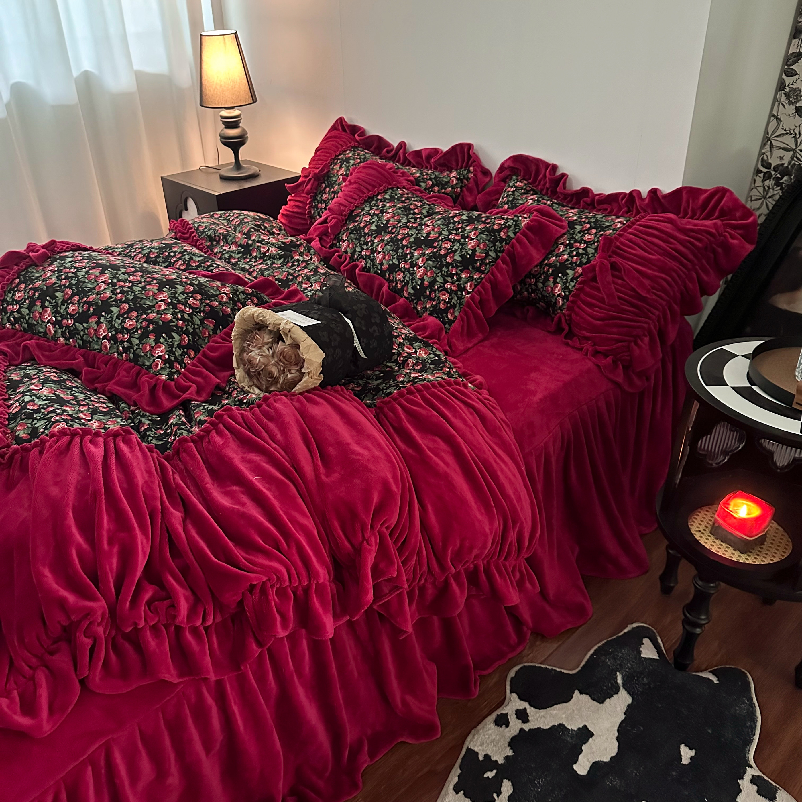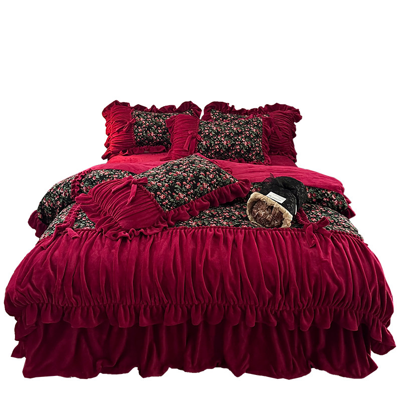 冬季加厚牛奶绒四件套碎花蝴蝶结被套公主风珊瑚绒床单床裙款婚庆