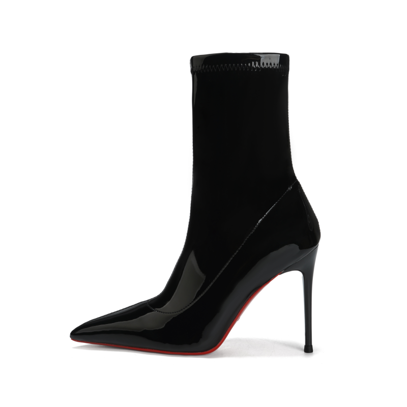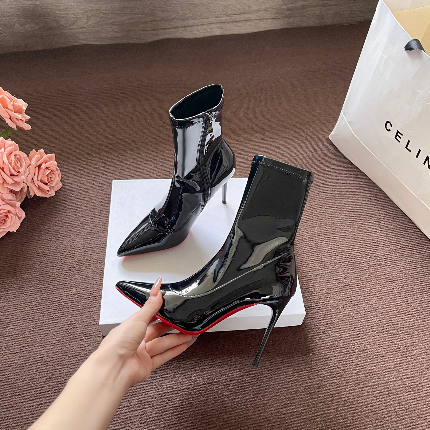 欧美2025冬季新款漆皮红底高跟短靴女细跟尖头性感气质侧拉链靴子