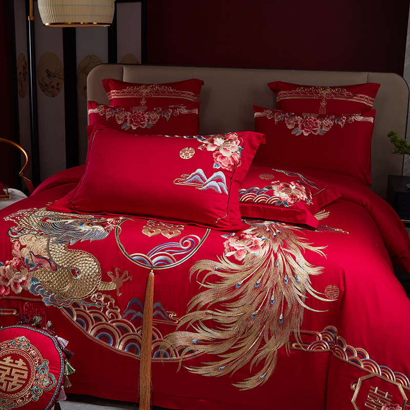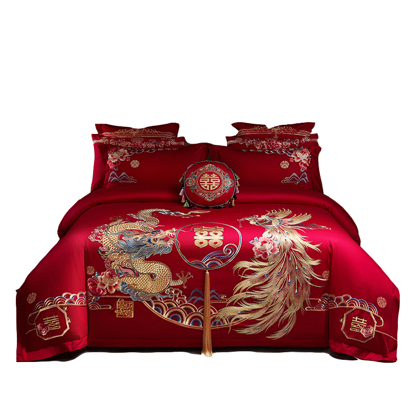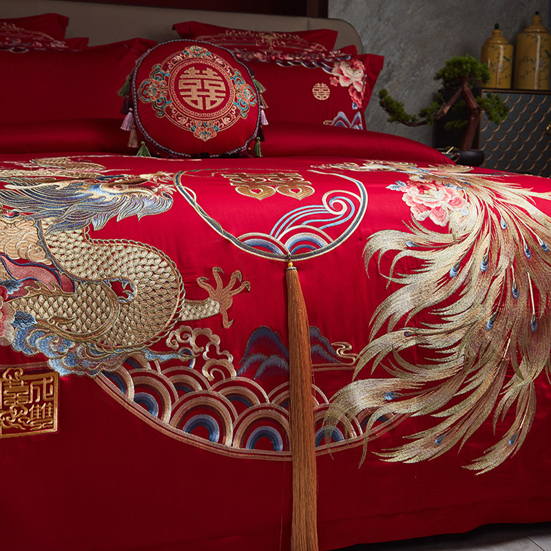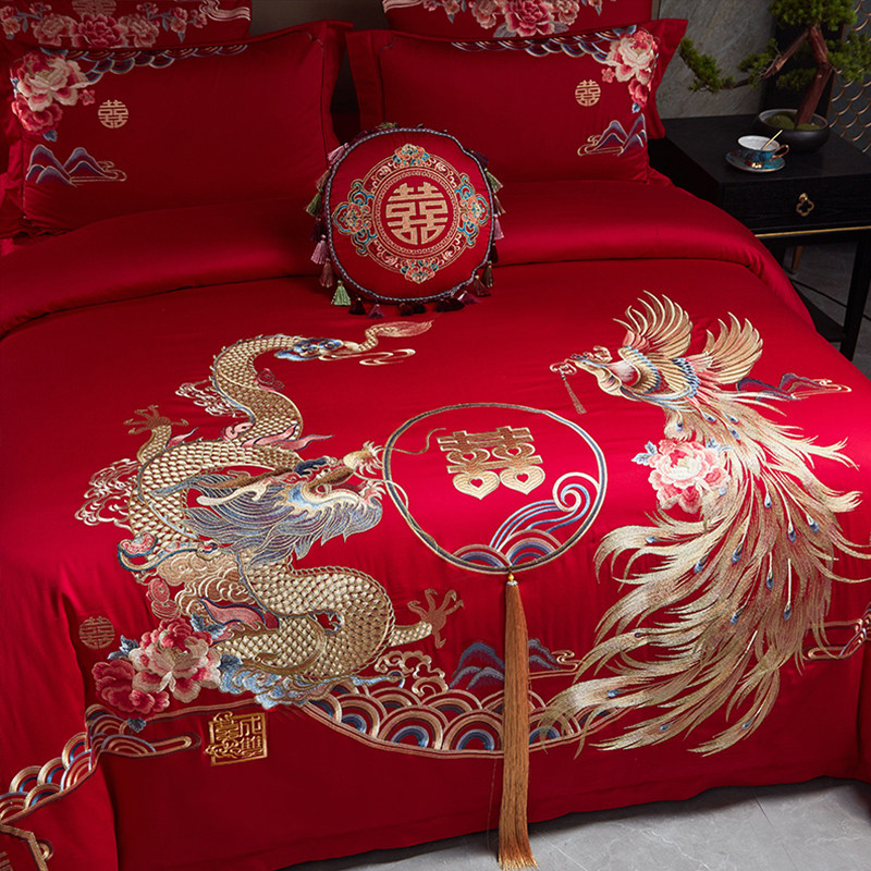 高档婚庆140支全棉四件套龙凤刺绣纯棉被套结婚红色床单喜字床品4