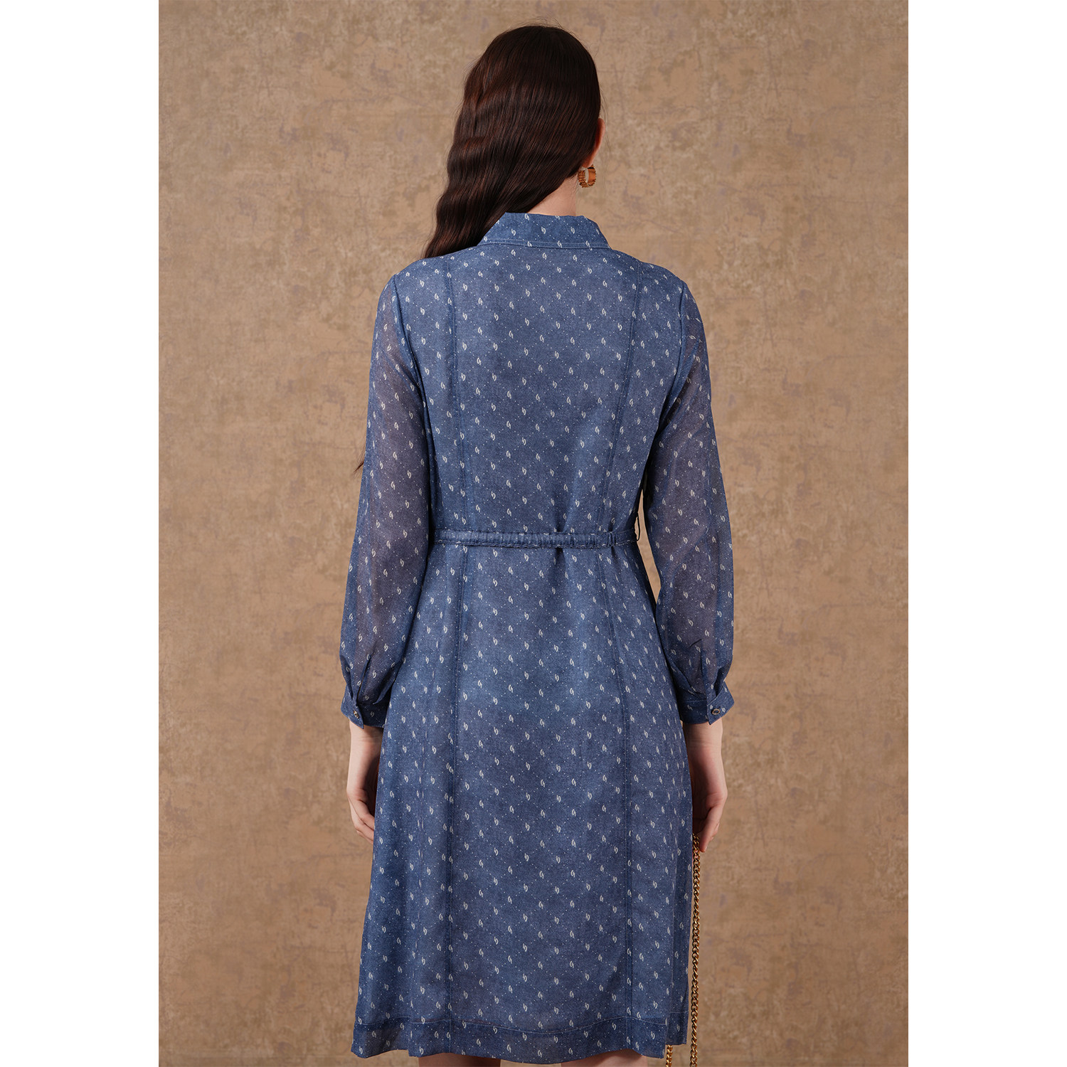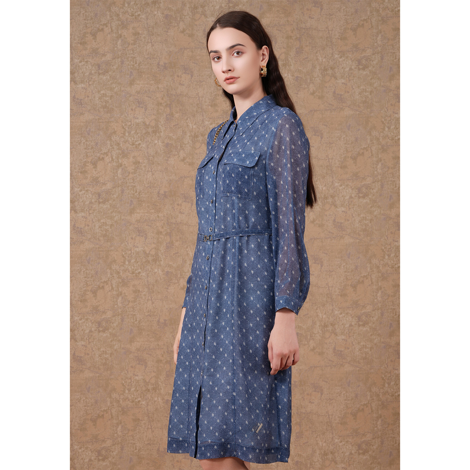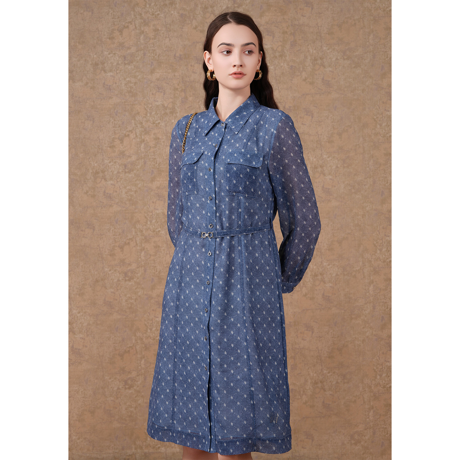 乔万尼秋新款蓝色印花修身优雅气质长袖雪纺连衣裙高级感EF3E885