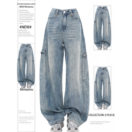 300斤胖mm大码浅色高腰显瘦弯刀牛仔裤女美式设计感工装阔腿裤子