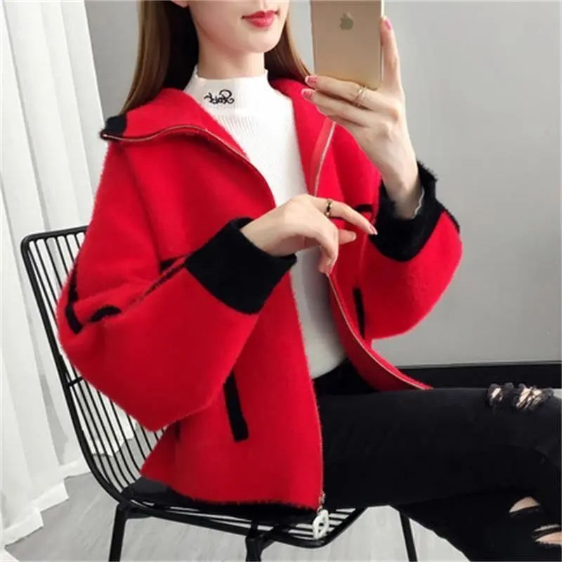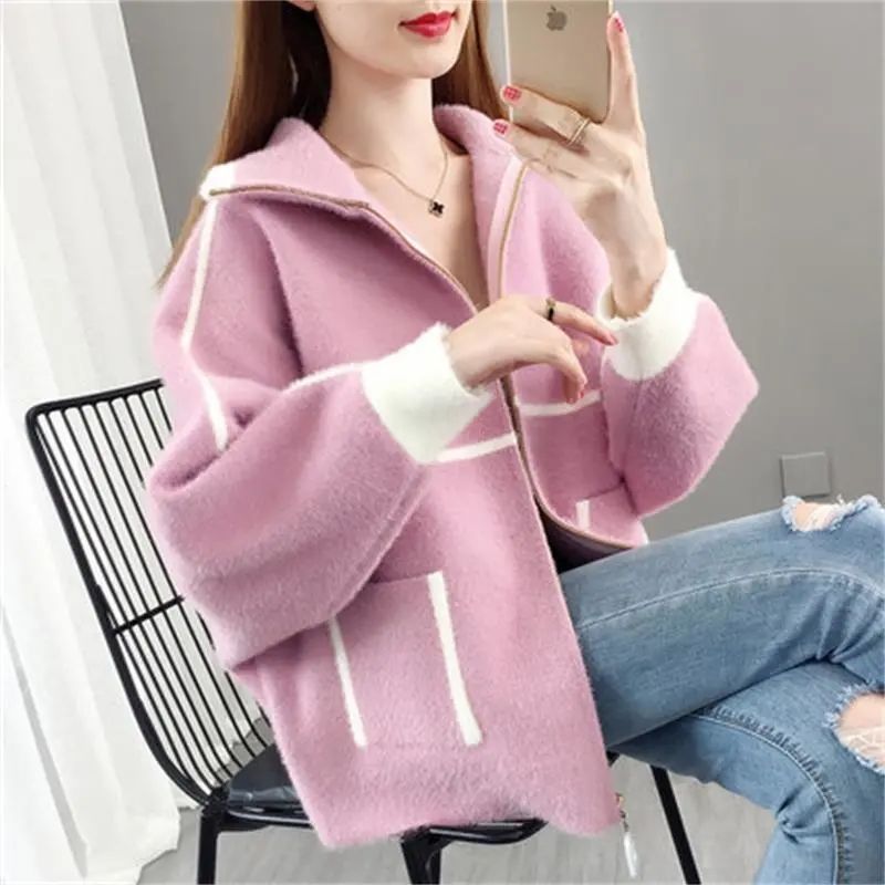 仿水貂绒针织开衫女2022秋冬新款长袖韩版宽松毛衣短款学院风外套