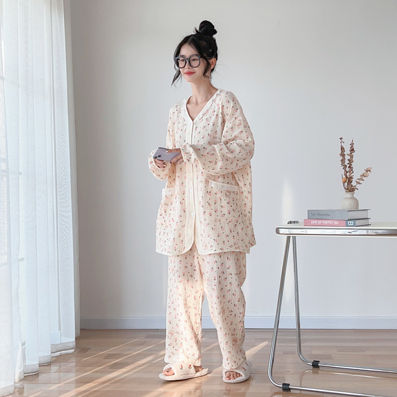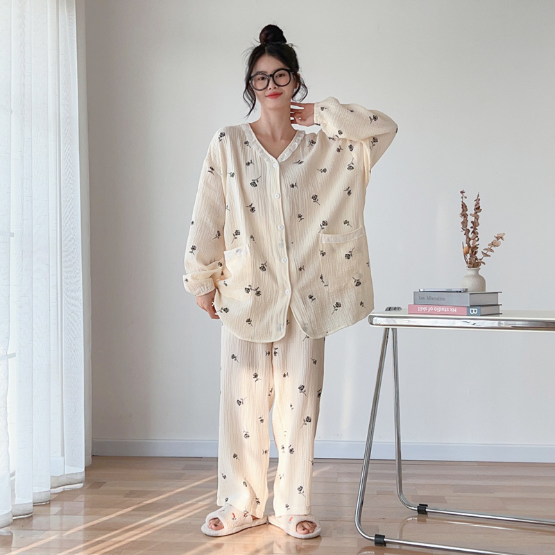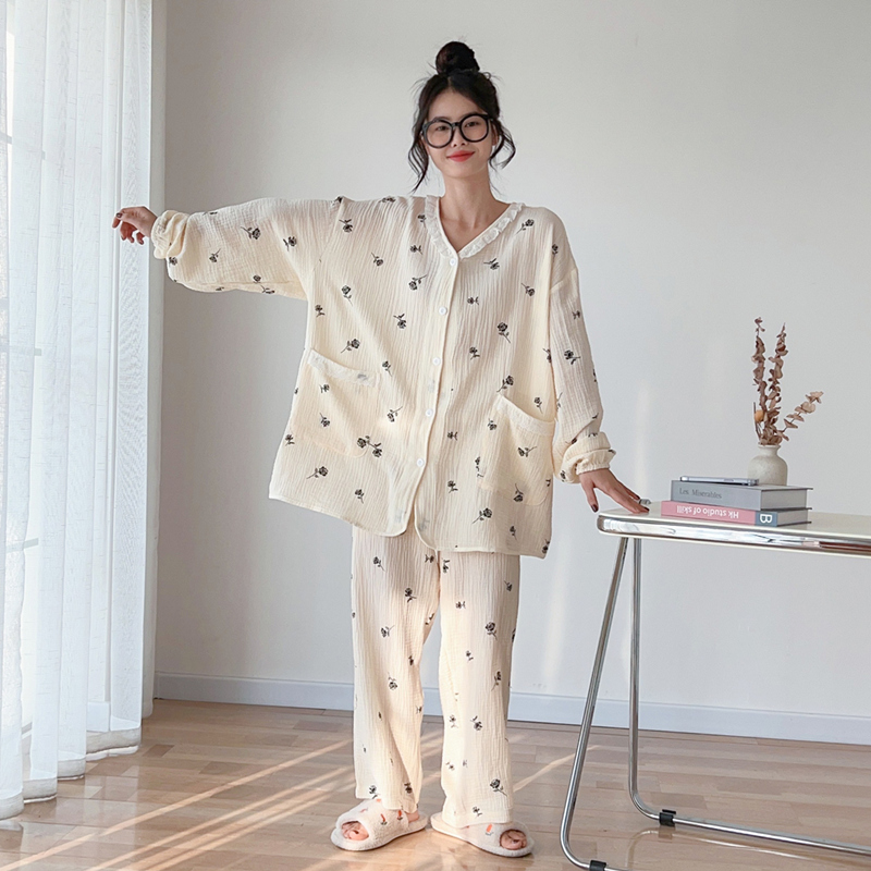 V领开衫纯棉纱布大码胖mm睡衣女200斤春秋长袖长裤甜美家居服套装