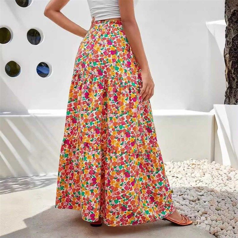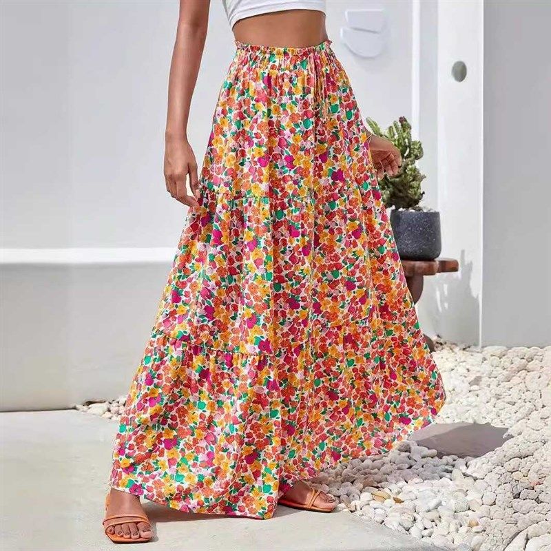 波西米亚夏季大码女度假风沙滩海边松紧腰收腰高腰碎花半身裙长裙