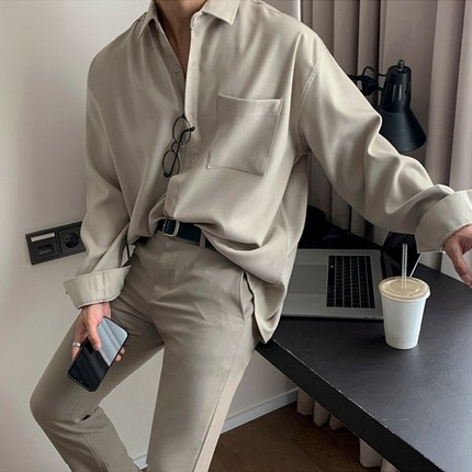 卡其色翻领男士衬衫长袖春秋季韩系轻熟风男装高级感痞帅垂感衬衣
