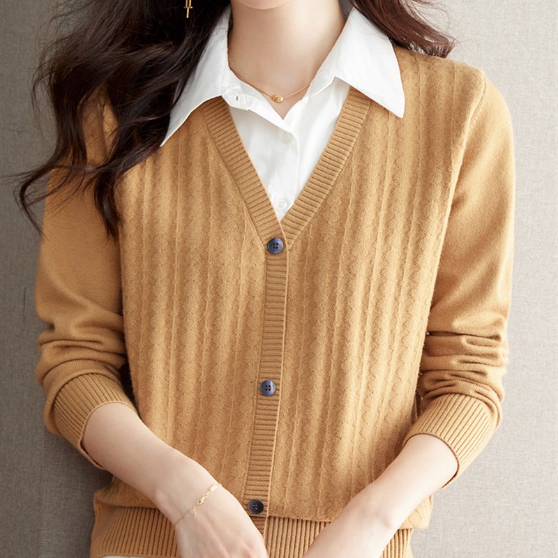 胖mm假两件针织打底羊毛上衣女春秋新款特大码洋气衬衫领长袖毛衣
