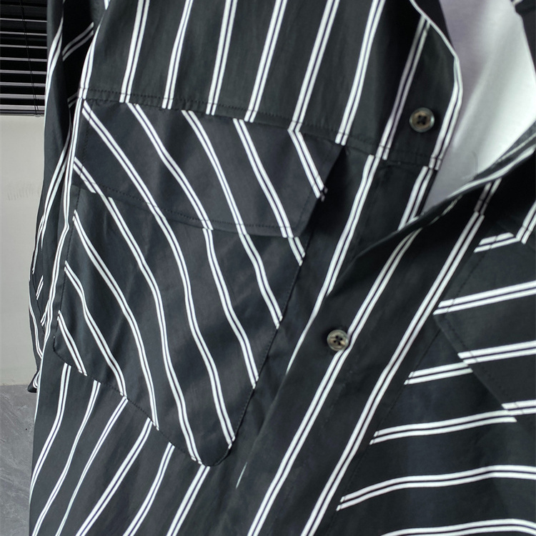 帅气小哥~条纹中袖衬衫男士新款港风潮流宽松衬衣服工装外套男X20