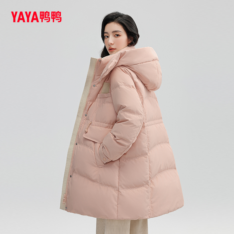 鸭鸭中长款大牌羽绒服女高端时尚撞色收腰款修身连帽加厚外套女冬