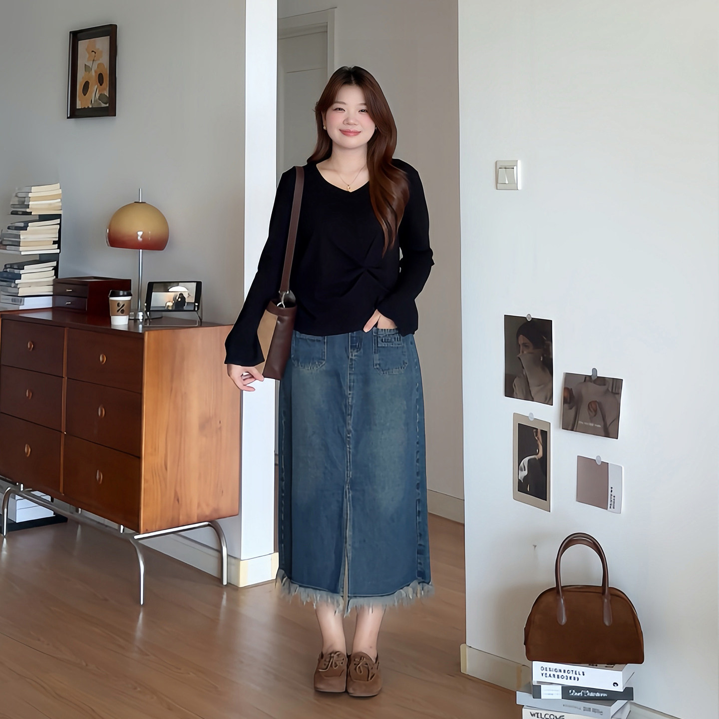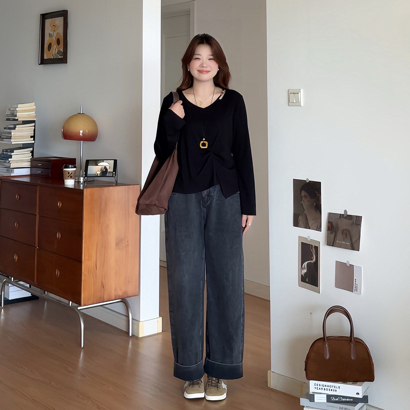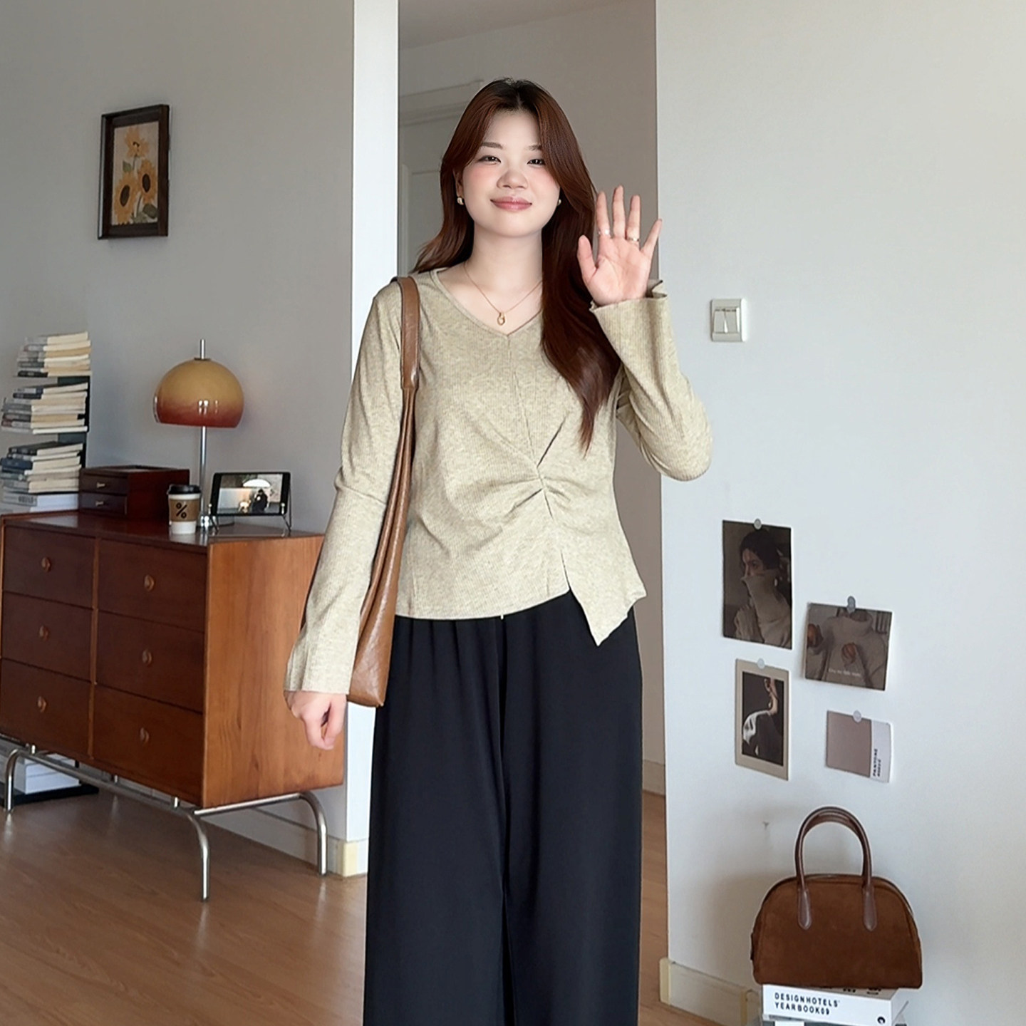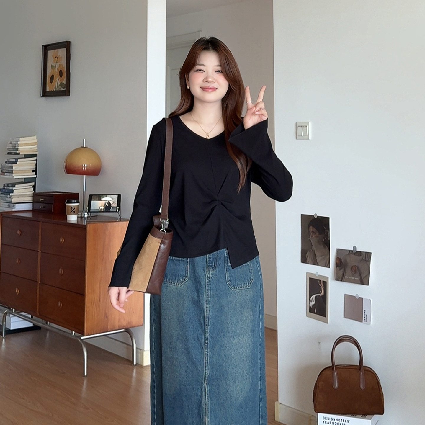 大码女装巨显瘦长袖V领针织上衣