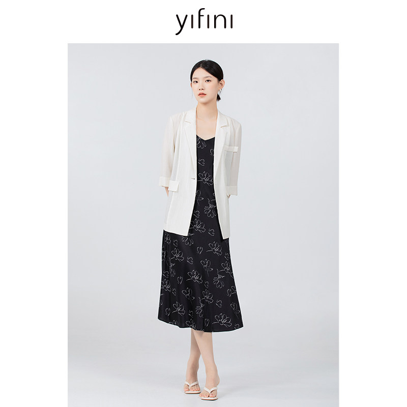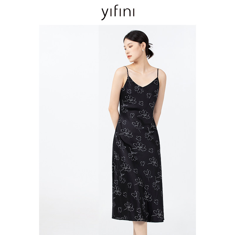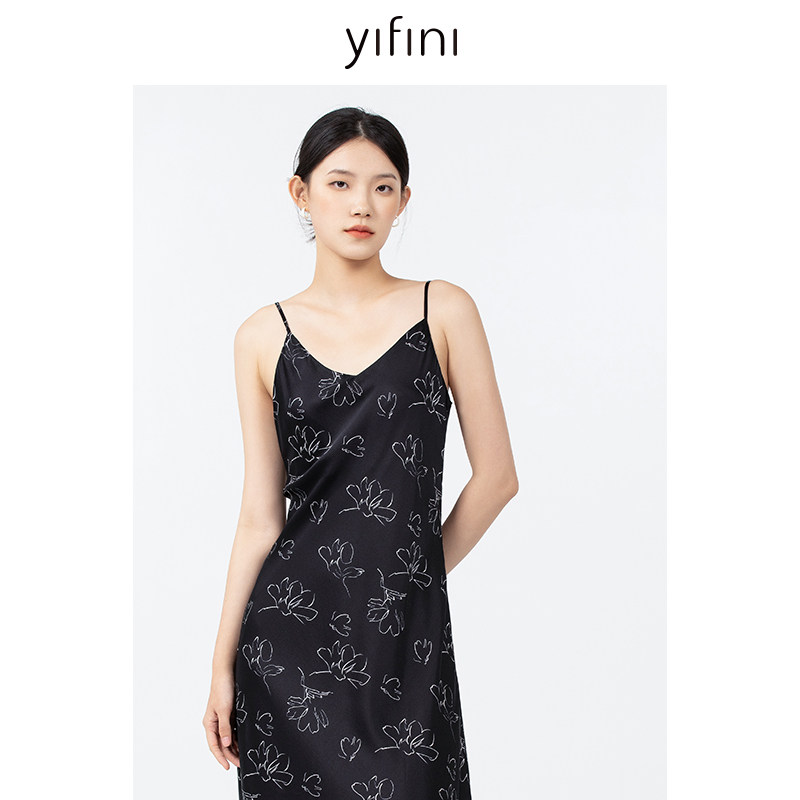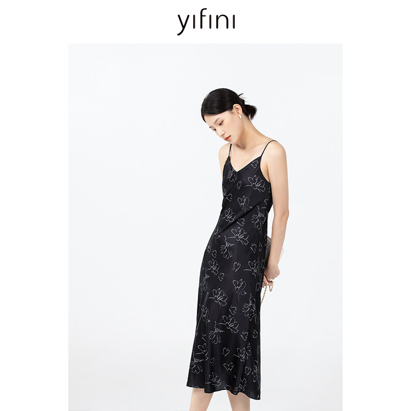 Yifini/易菲气质优雅印花吊带连衣裙女夏装新款真丝中长款裙
