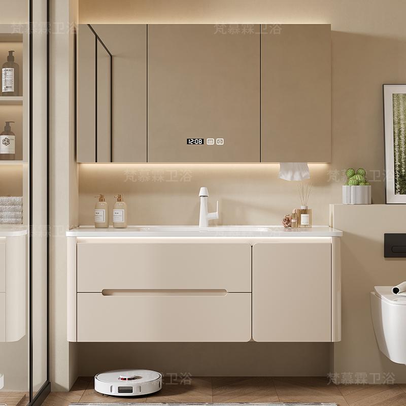 居家好物奶油风实木浴室柜陶瓷一体盆卫生间洗脸池多功能智能柜
