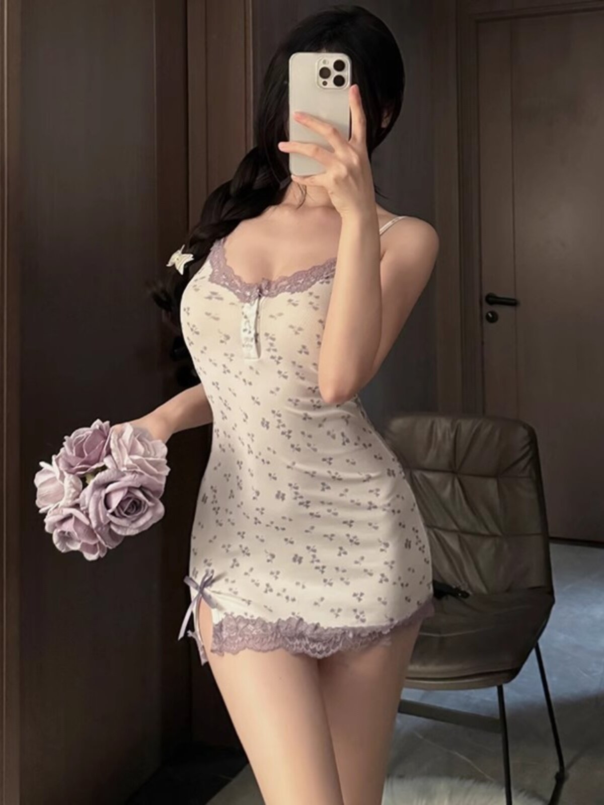 性感睡衣蕾丝纯欲紫色带胸垫碎花舒适吊带紧身夏季睡裙女2024新款