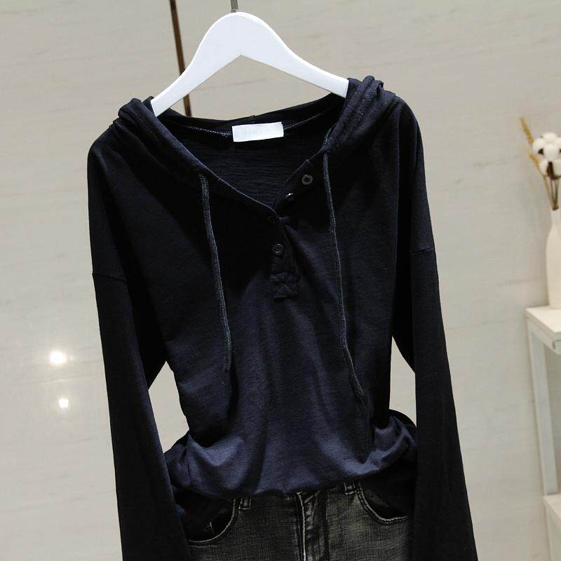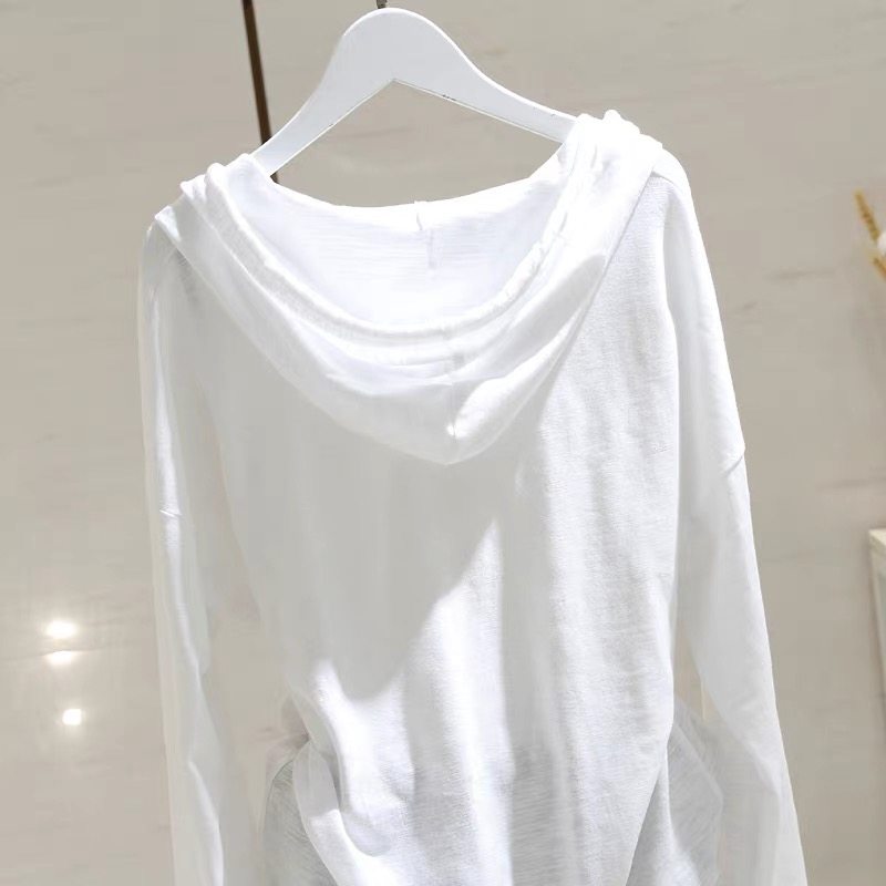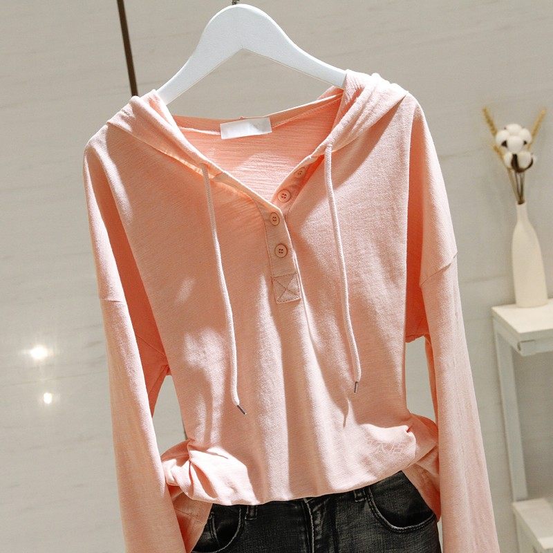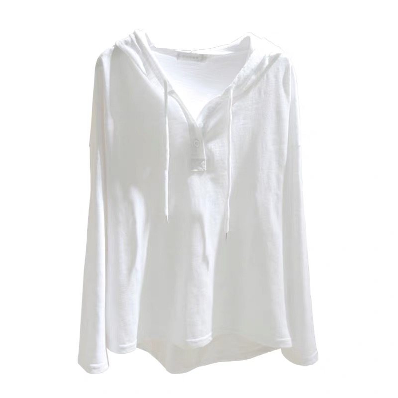 广州十三行高货~白色连帽长袖T恤女竹节纯棉打底衫宽松卫衣帽衫