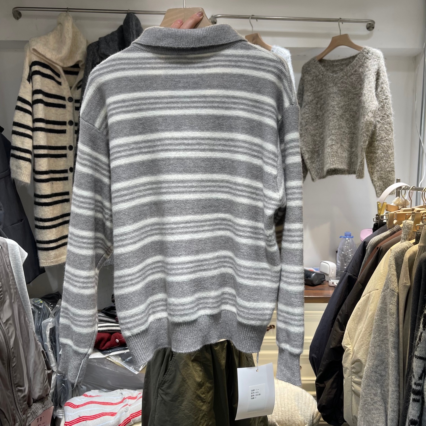 法式翻领polo衫条纹穿搭高级感套头宽松毛衣女2025秋冬上衣ins潮