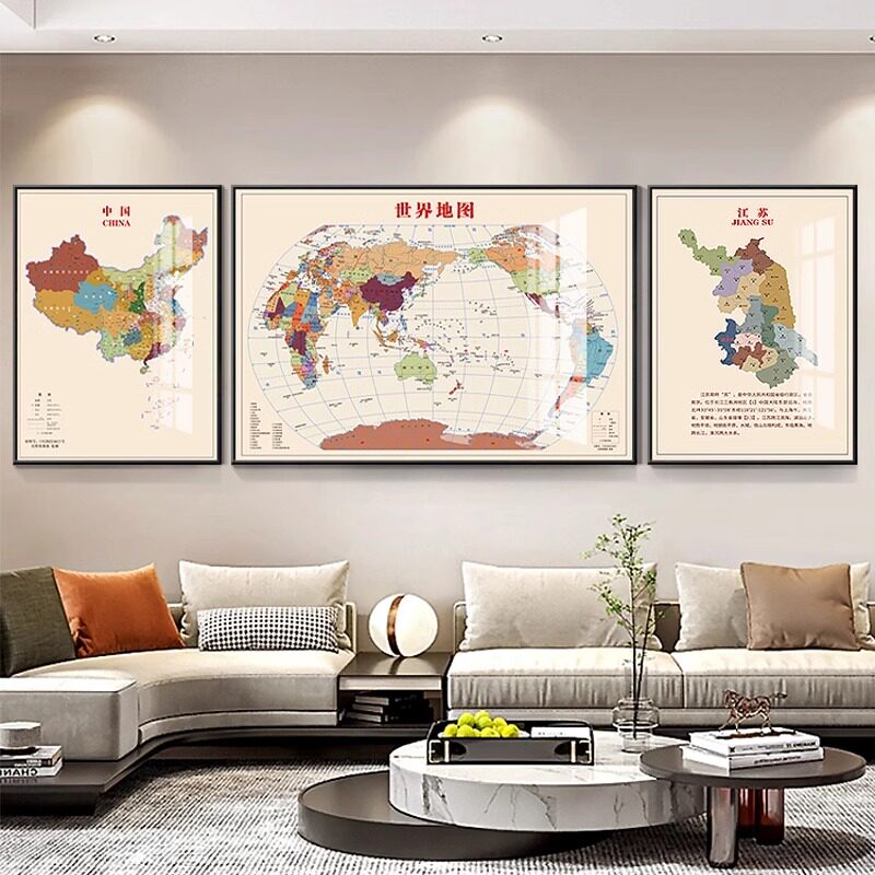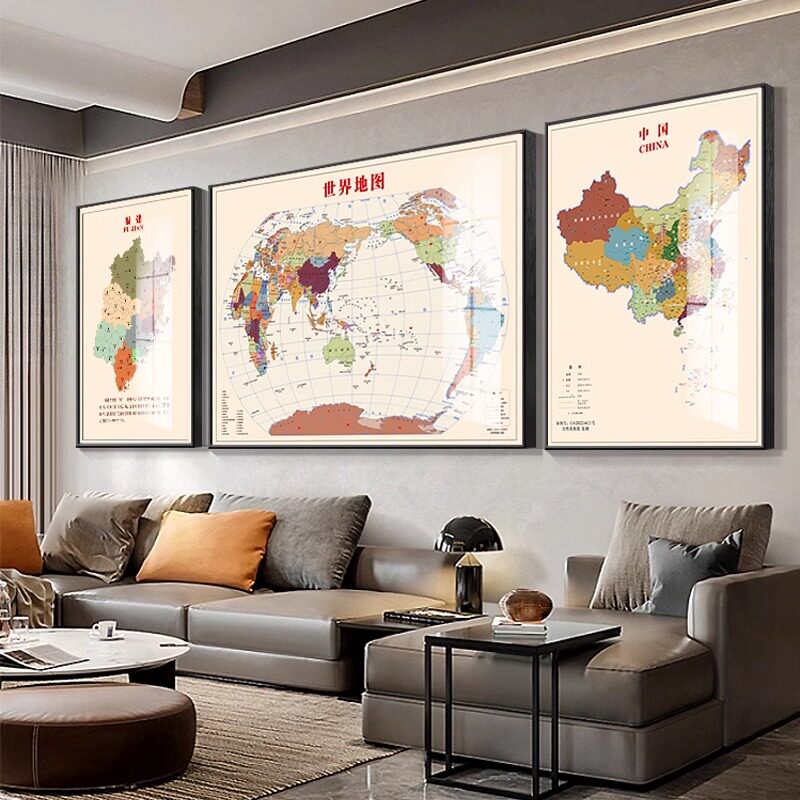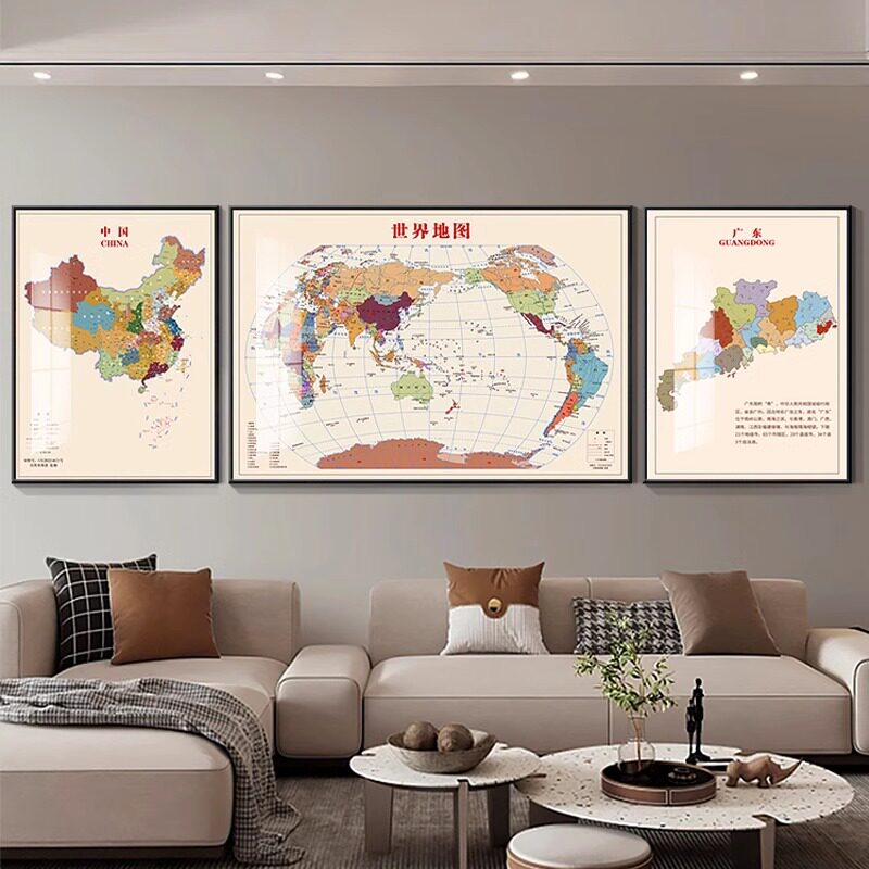 世界中国地图装饰画现代客厅沙发背景墙挂画办公室会议室三联壁画